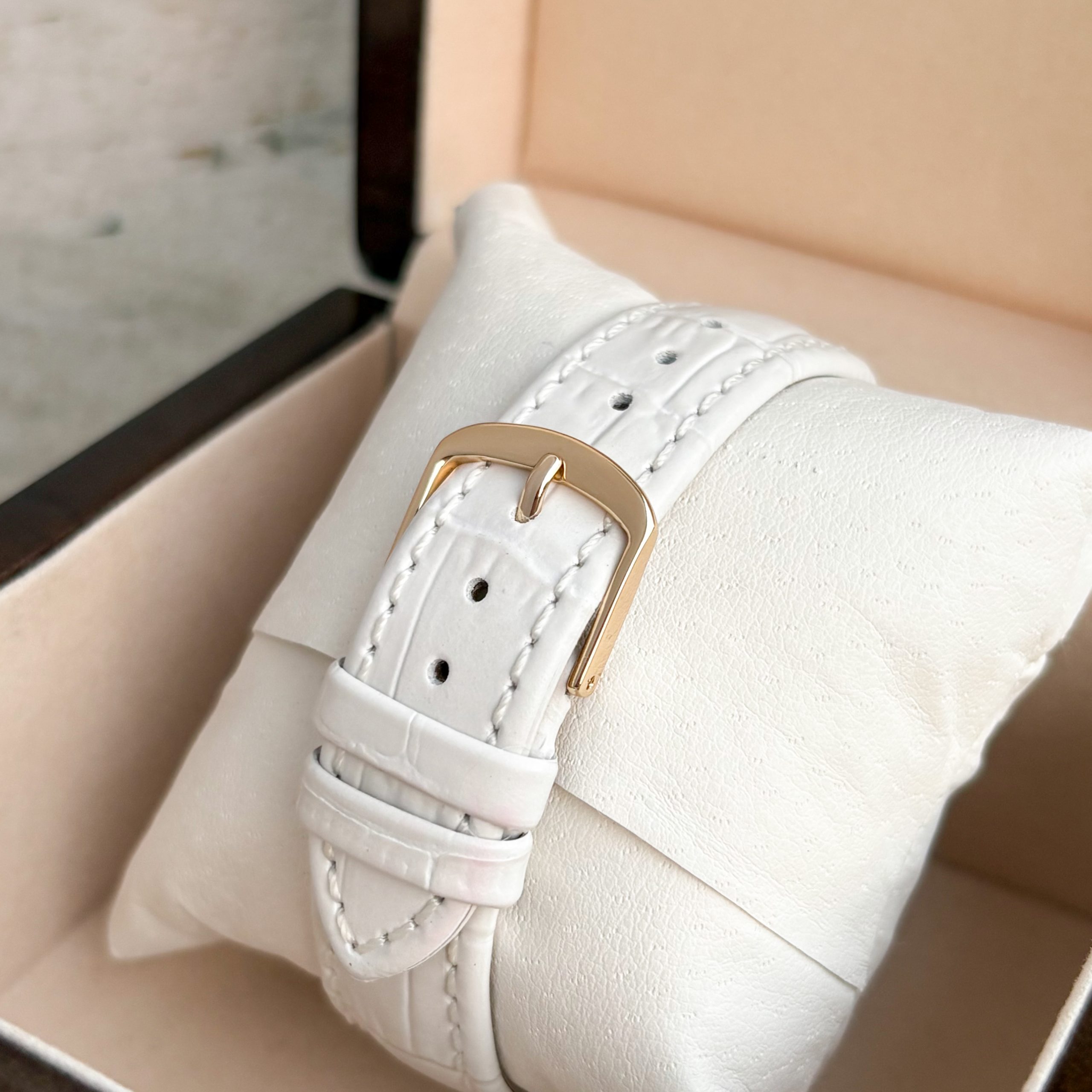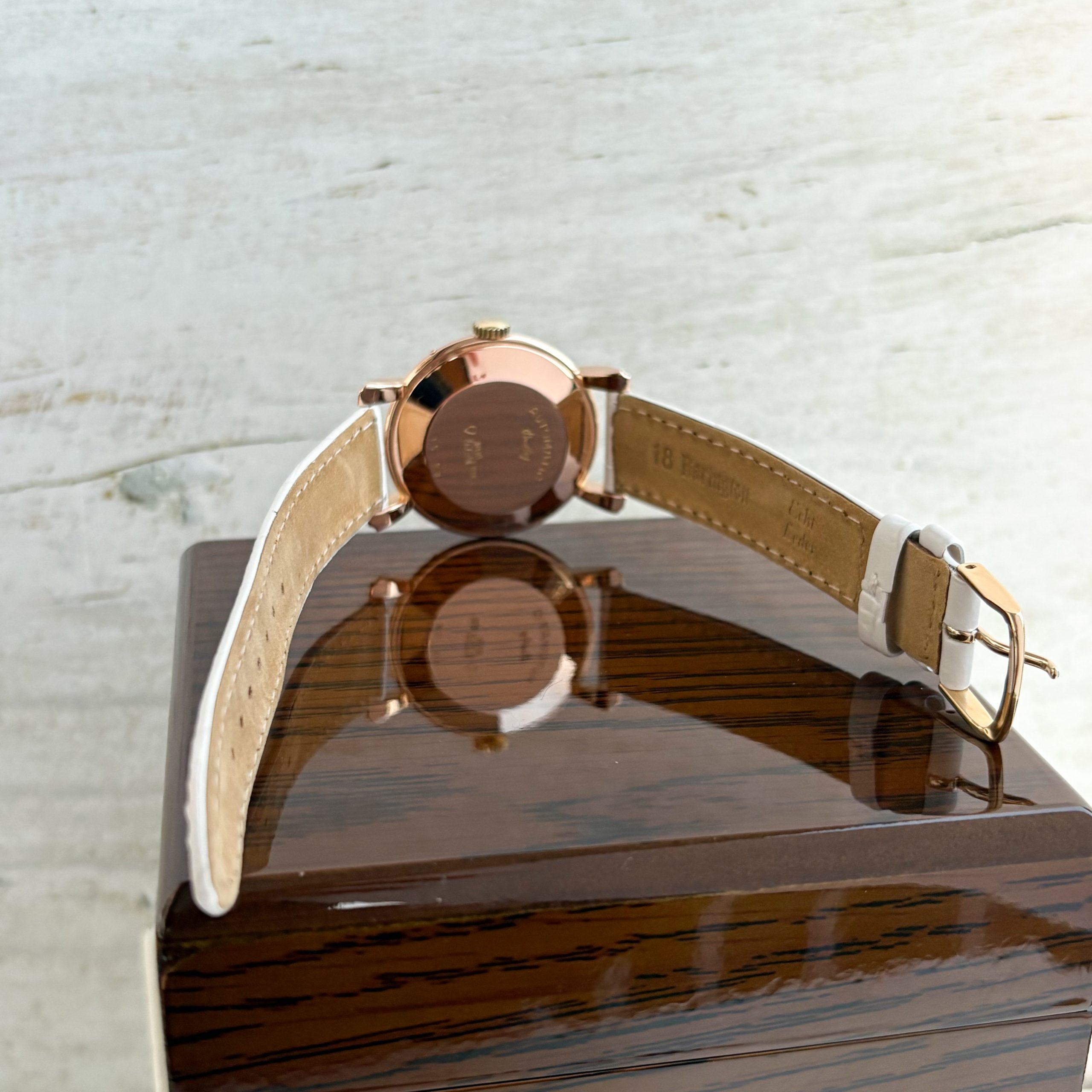 Bezel: 18k RoseGold Dial: champagne Crystal: Plexiglas Bracelet: Leather strap White Buckle: Pin buckle Steel Crown: Steel Crown Box: Our company's Watch Box Paper: Certificate of Authenticity Working Condition: Very good Optical Condition: Good Warranty: One-year warranty on used watches
