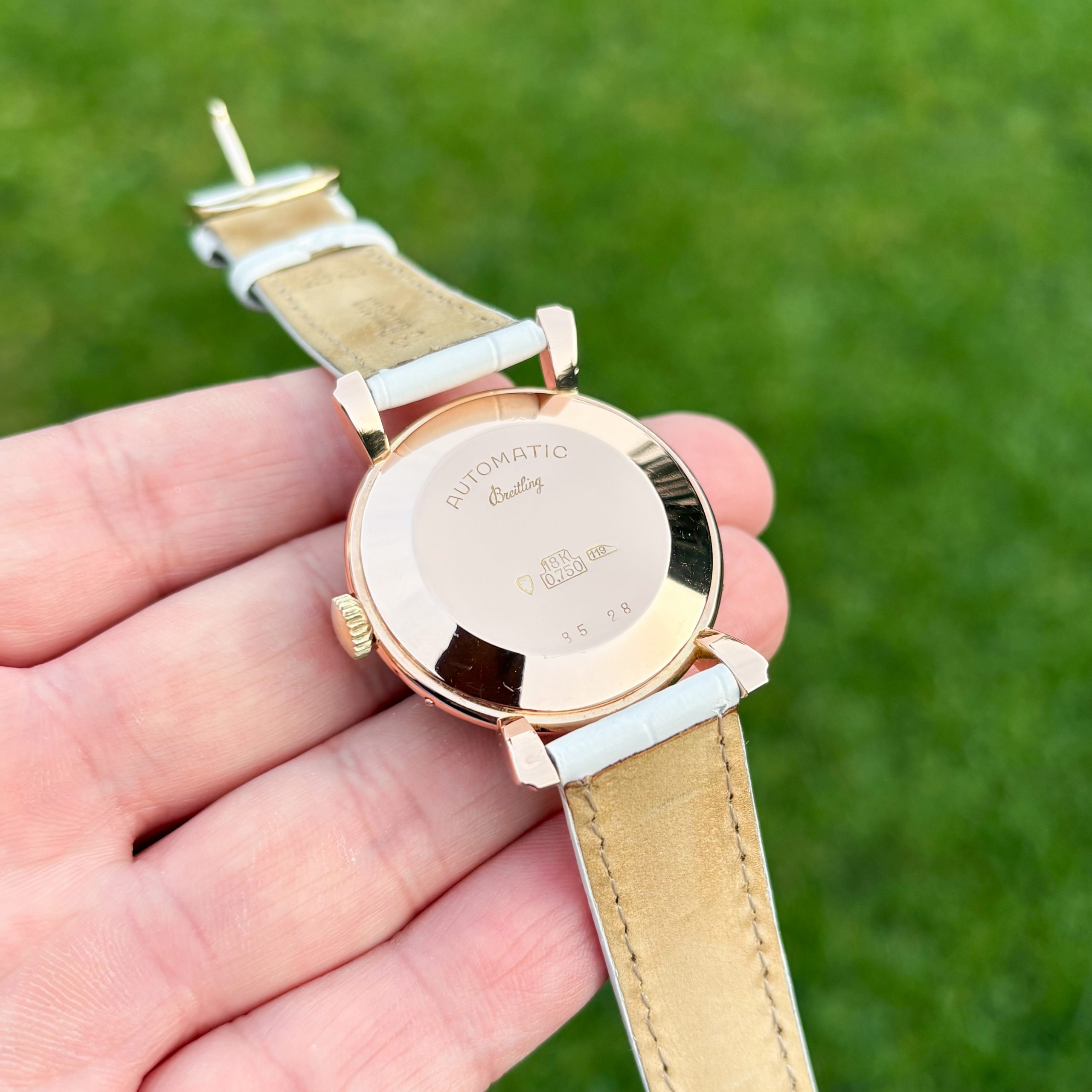 Marke: Breitling Modell: Datora Ref: 85-28 Uhrwerk: Automatik Jahr: 1950 (Ungefähre Angabe) Gehäuse: 18k Rosegold Lünette: 18k Rosegold Zifferblatt: Champagner Glas: Plexiglas Armband: Lederarmband Weiß Schließe: Dornschließe Stahl Krone: Stahl Krone Box: Hauseigene Uhrenbox Papiere: Hauseigenes Echtheitszertifikat Technischer Zustand: Sehr guter Zustand Optischer Zustand: Guter Zustand Garantie: Ein Jahr Garantie auf gebrauchte Uhren