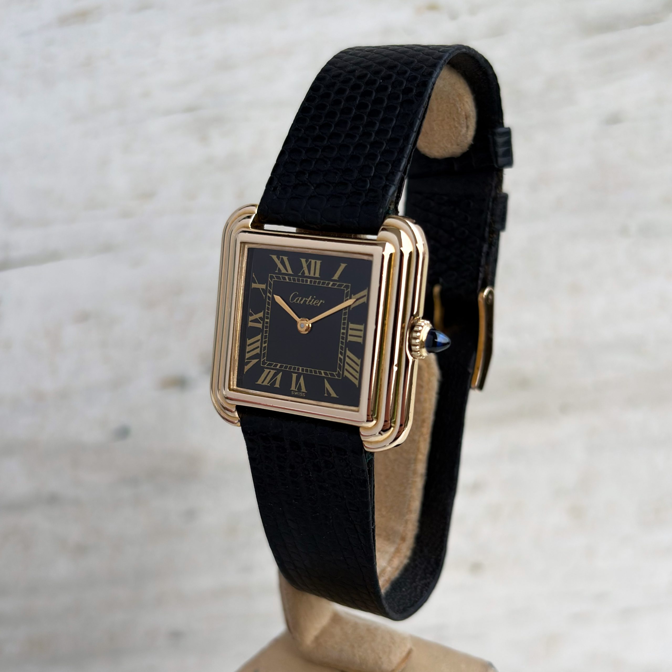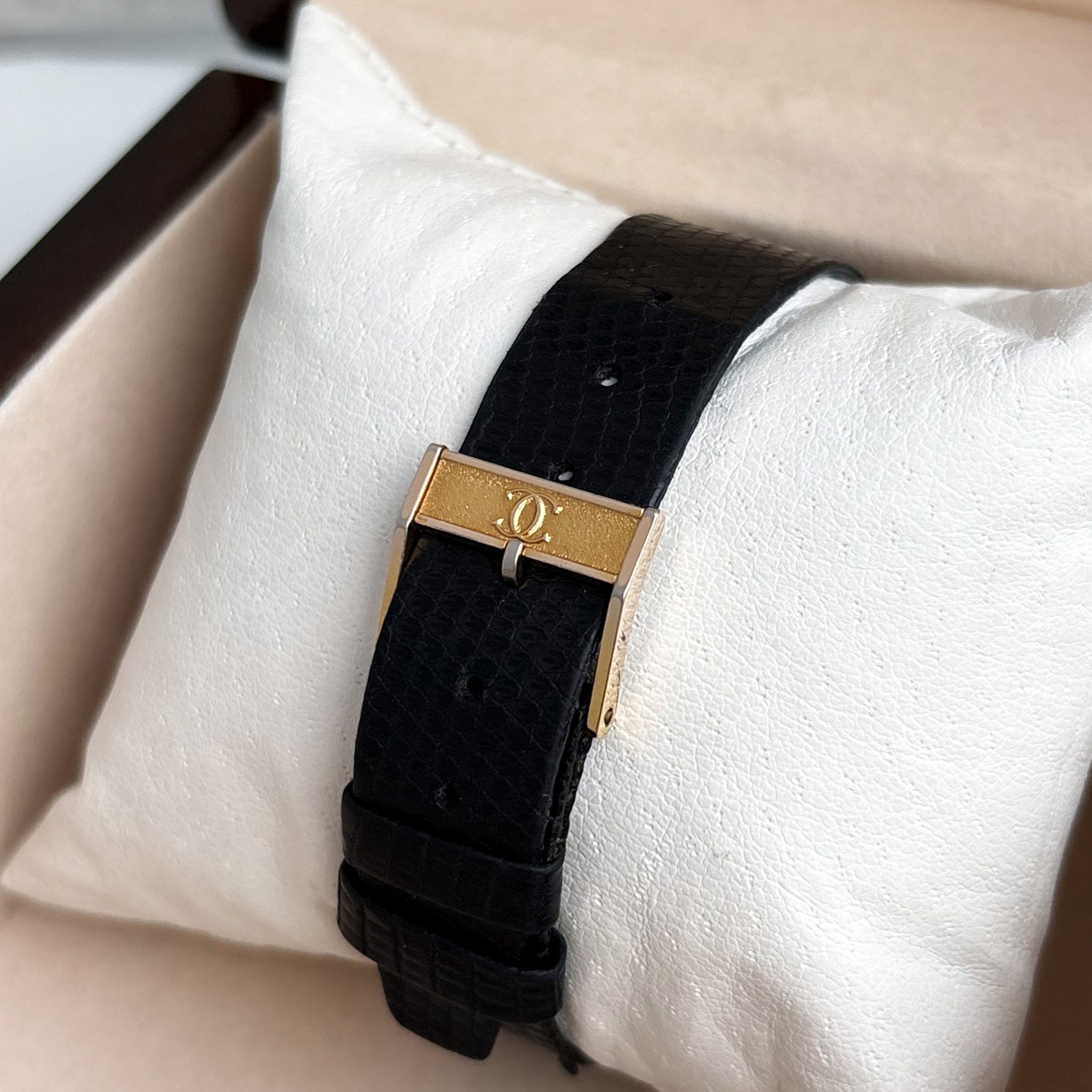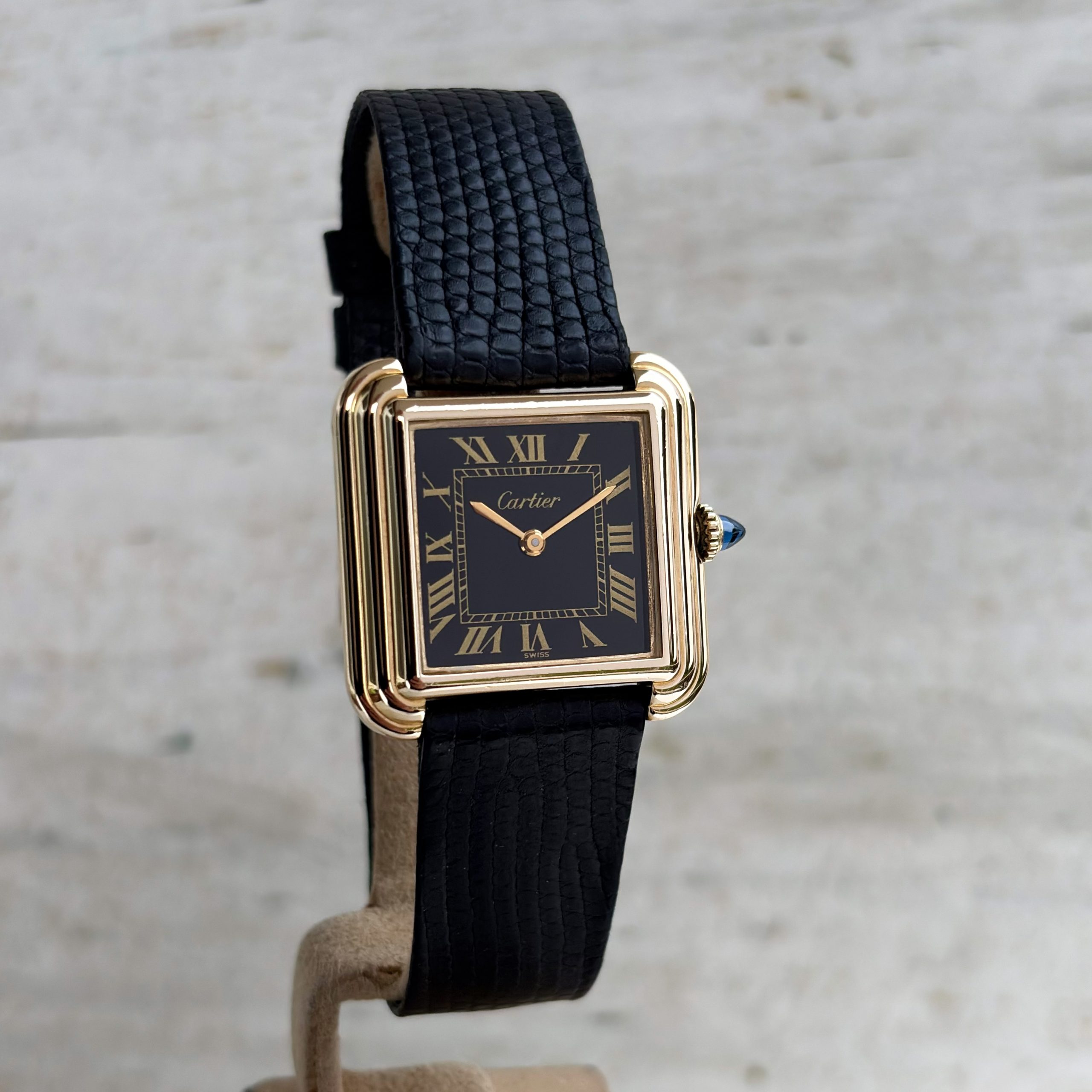 Bezel: Steel / Gold-plated Dial: Black Crystal: Mineralglas Bracelet: Leather Strap black Cartier Buckle: Steel / Gold-plated buckle Crown: Cartier Crown Box: Company's watch box Paper: Certificate of Authenticity Working Condition: Very good Optical Condition: Very good Warranty: One-year warranty on used watches