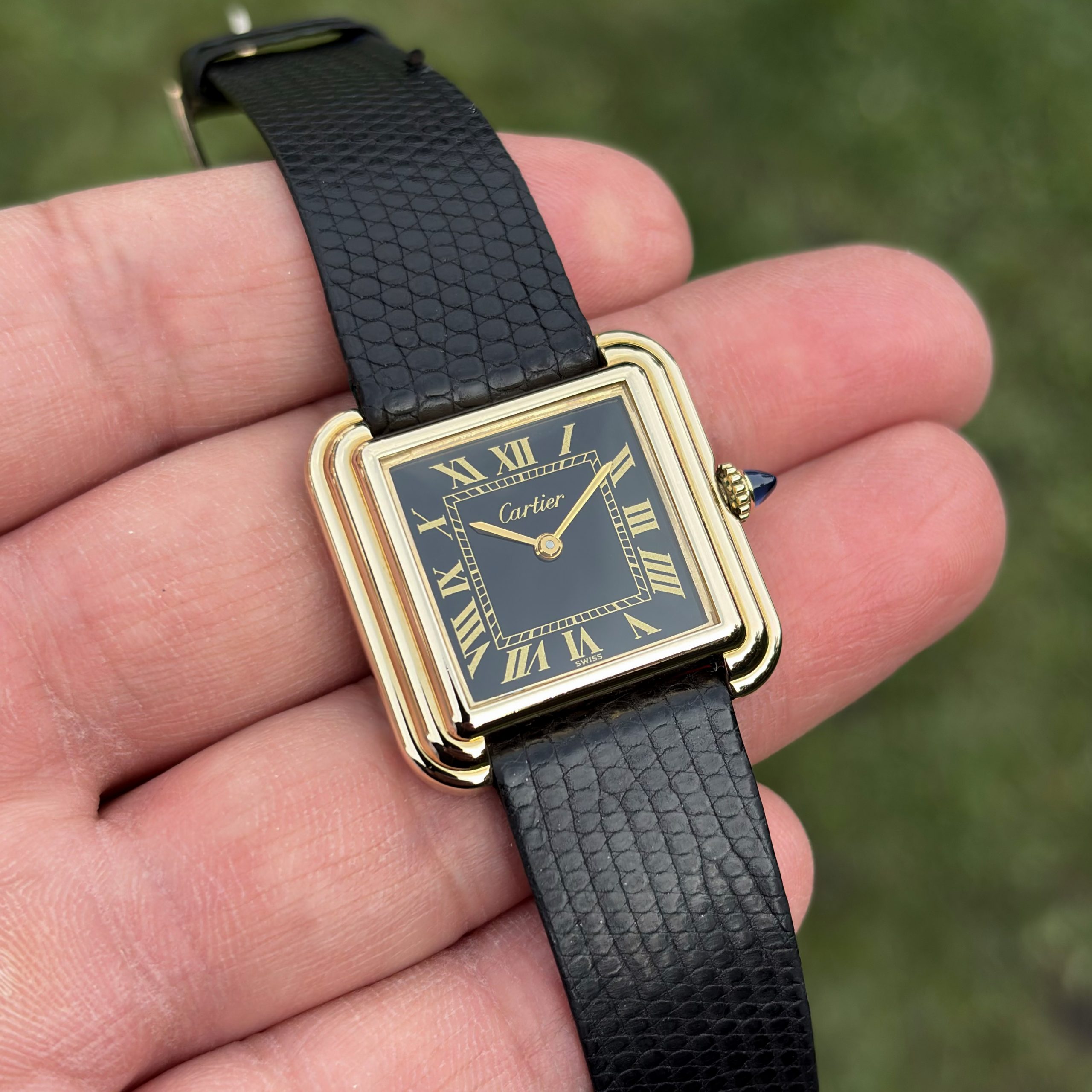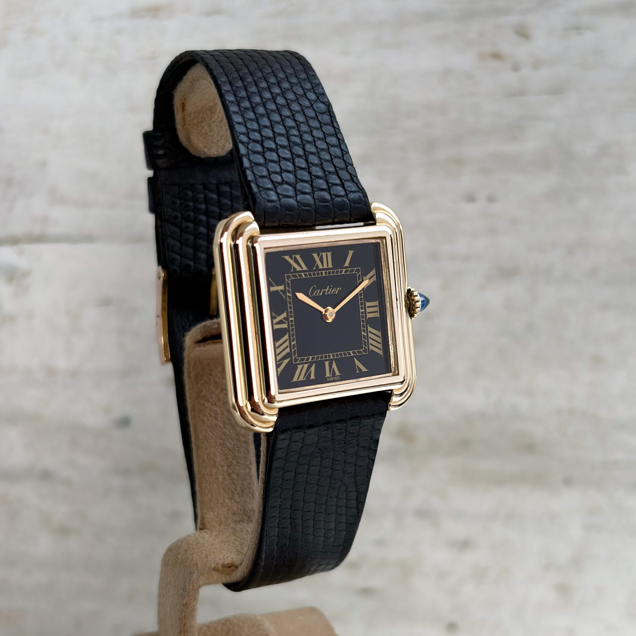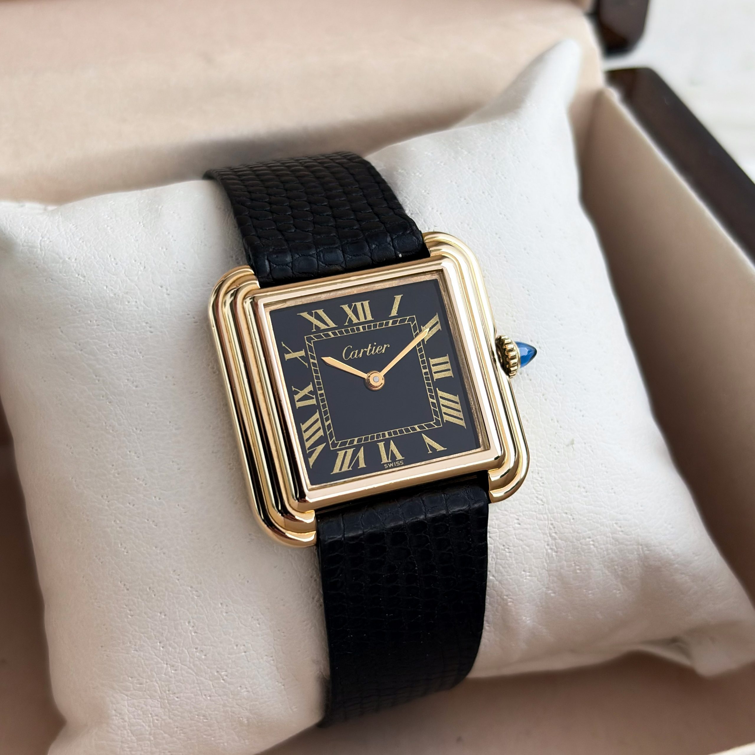 Bezel: Steel / Gold-plated Dial: Black Crystal: Mineralglas Bracelet: Leather Strap black Cartier Buckle: Steel / Gold-plated buckle Crown: Cartier Crown Box: Company's watch box Paper: Certificate of Authenticity Working Condition: Very good Optical Condition: Very good Warranty: One-year warranty on used watches