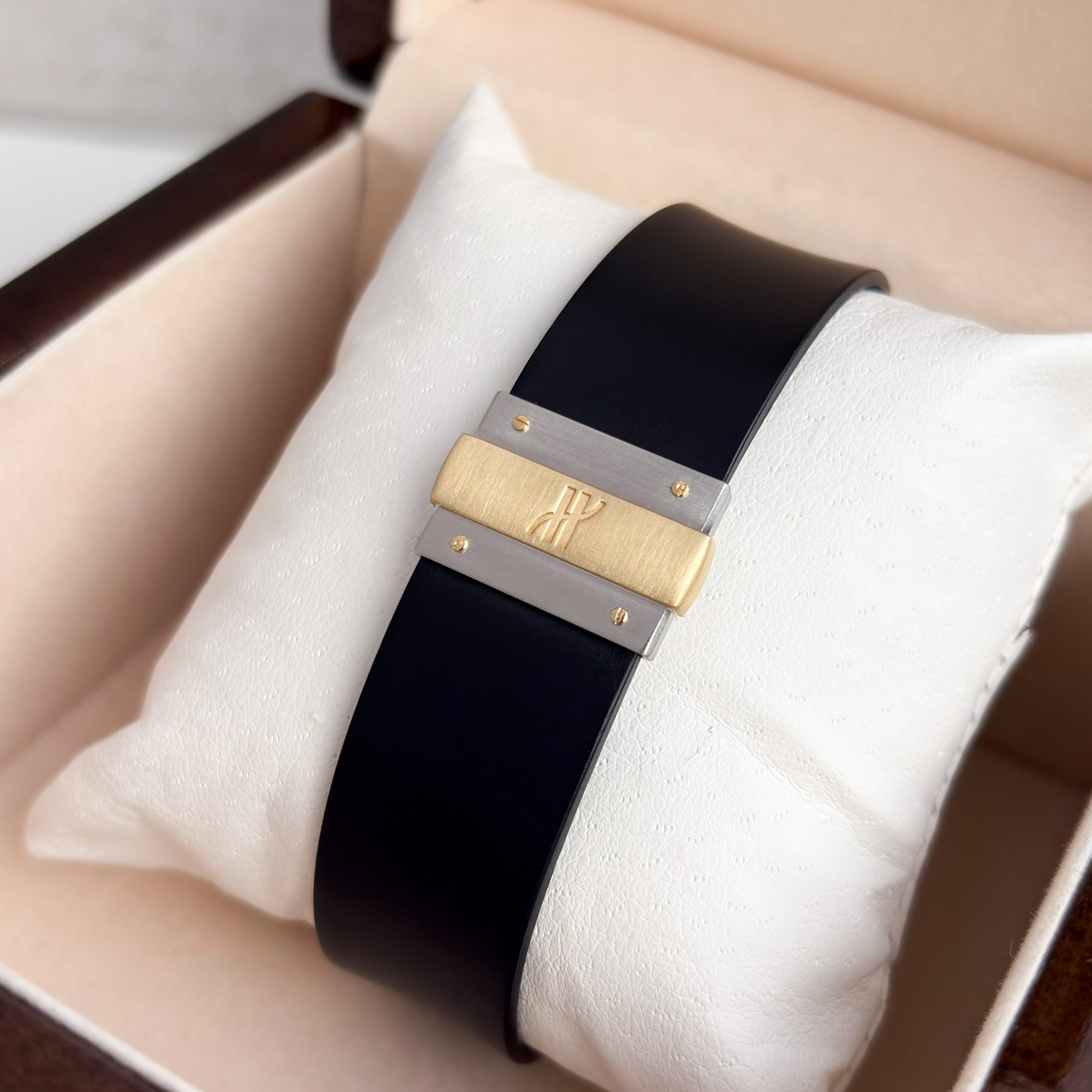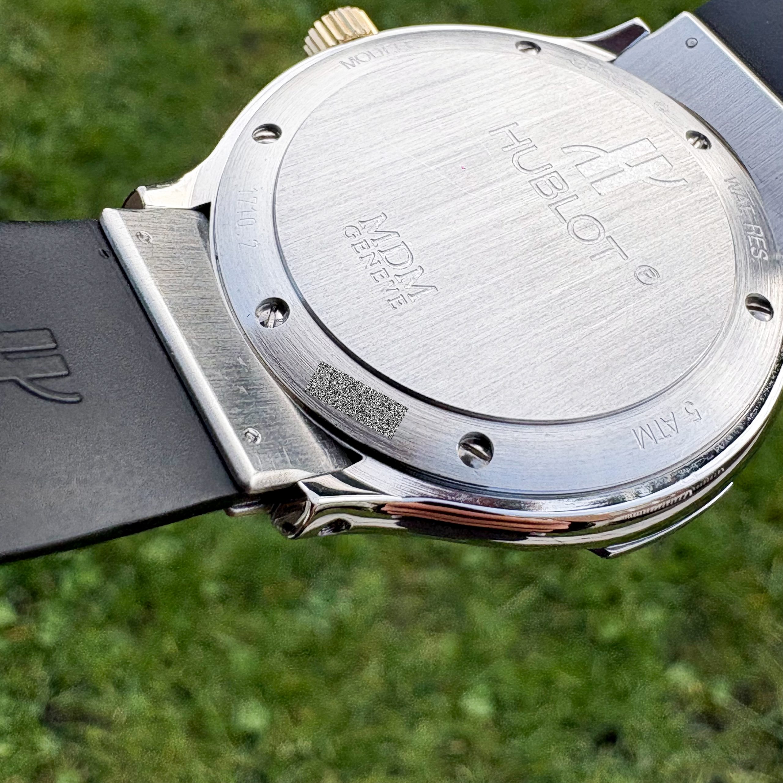 Marke: Hublot Modell: Elegant Ref: 1710.2 Uhrwerk: Automatik Jahr: 2000 (Ungefähre Angabe) Gehäuse: Stahl/Gold Zifferblatt: Schwarz Glas: Saphirglas Armband: Kautschuk Armband Schwarz Schließe: Hublot Faltschließe Krone: Hublot Krone Funktion: Datum, Stunde, Minute, Zentralsekunde Box: Hauseigene Uhrenbox Papiere: Hauseigenes Echtheitszertifikat Technischer Zustand: Sehr guter Zustand Optischer Zustand: Sehr guter Zustand Garantie: Ein Jahr Garantie auf die gebrauchten Uhren