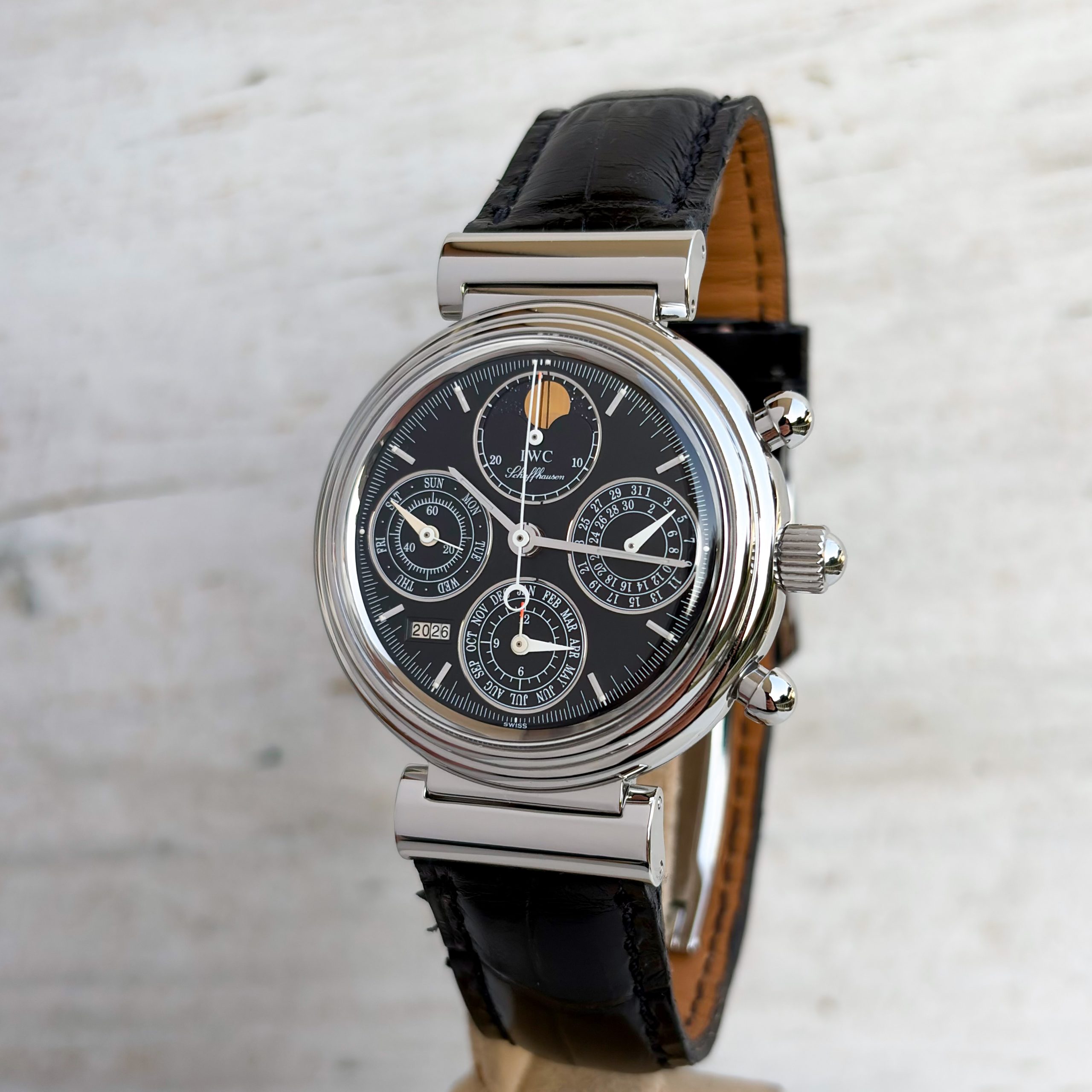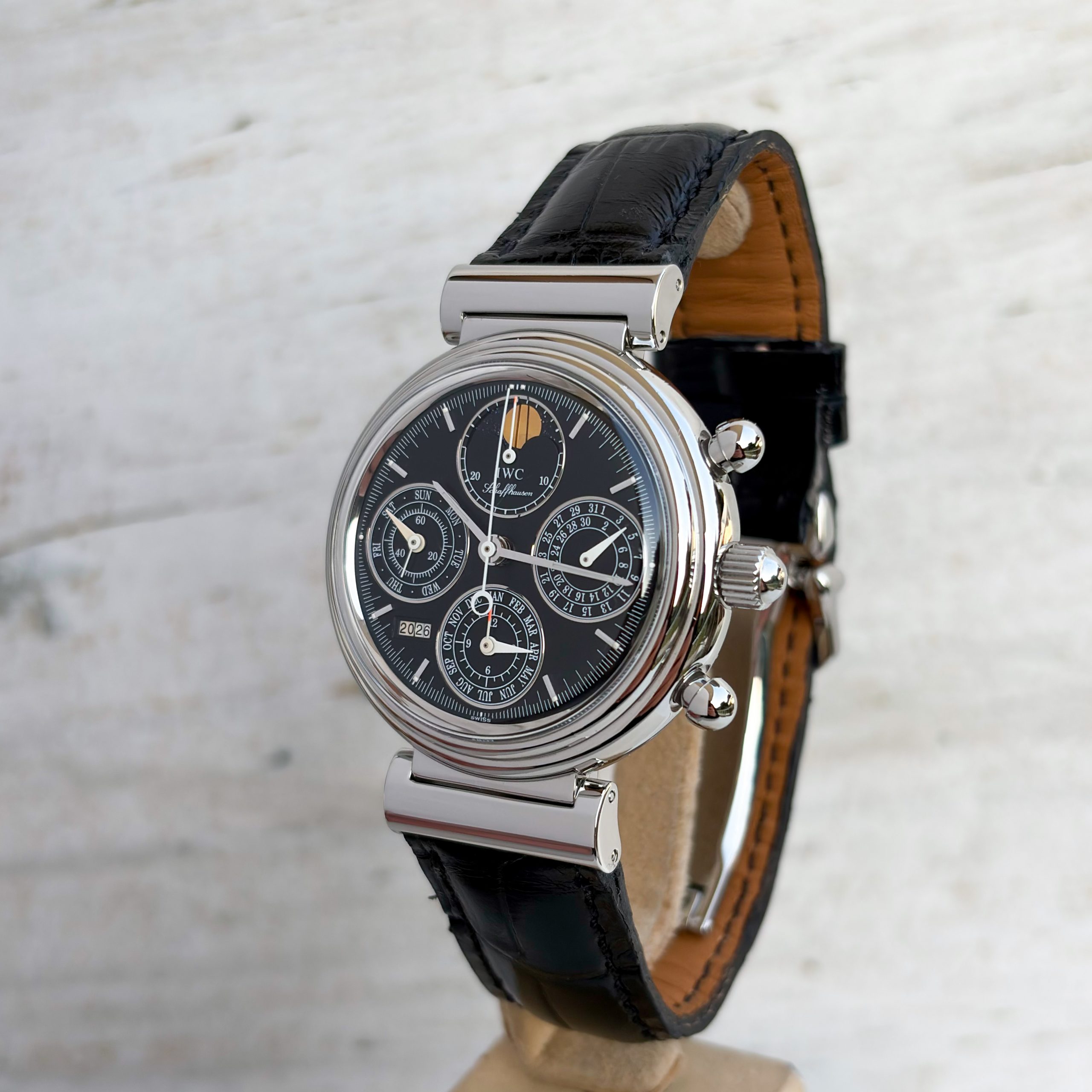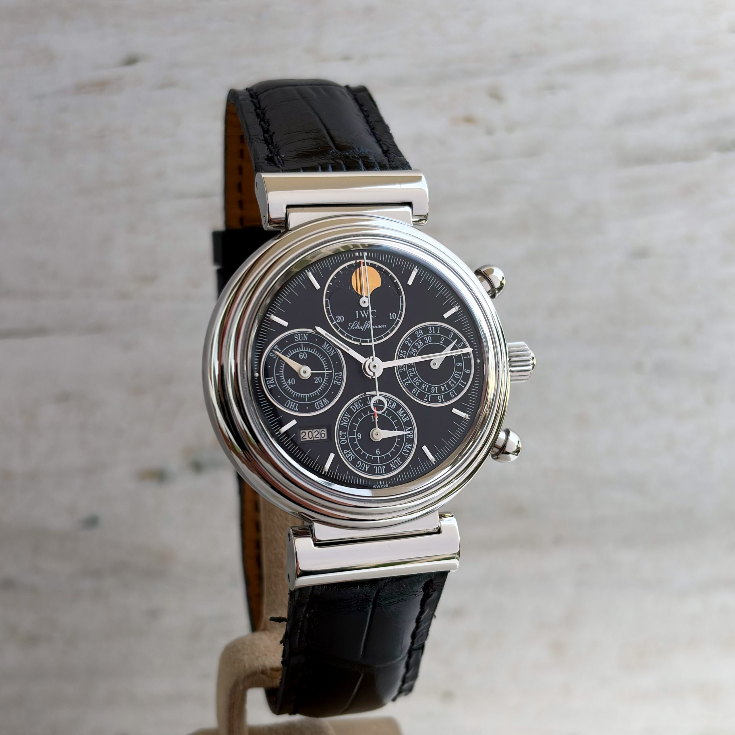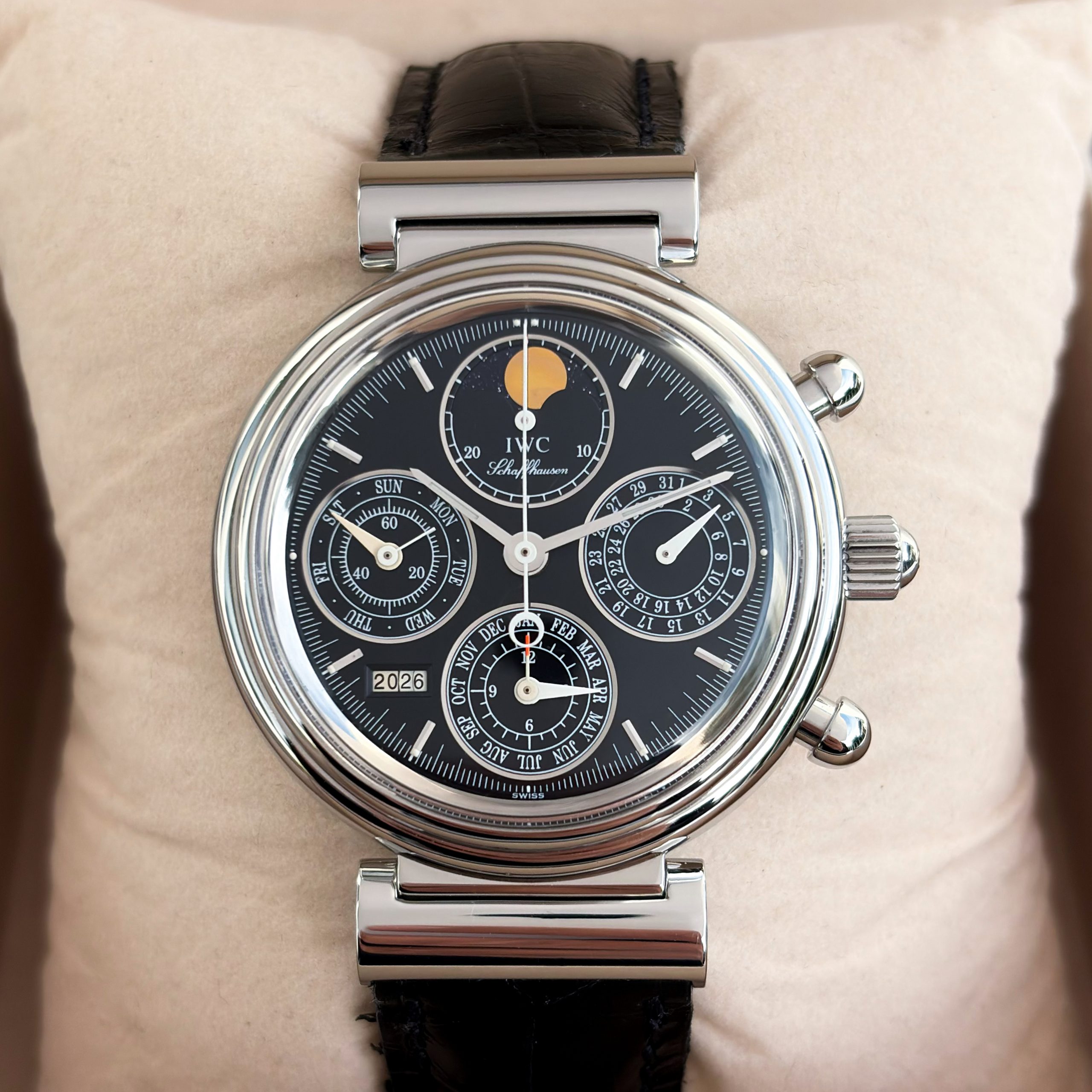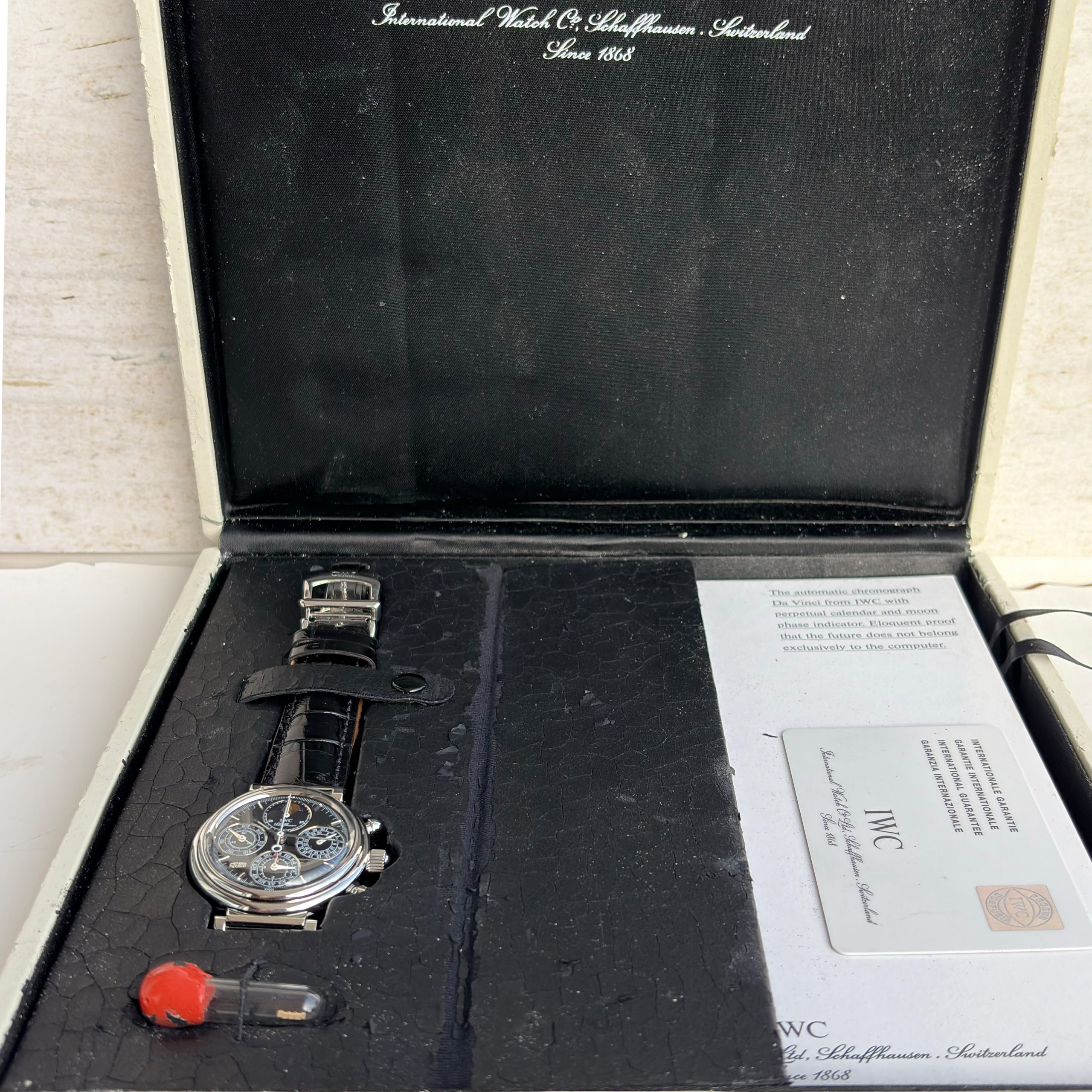 Marke: IWC Modell: Da Vinci Ref: IW3750 Uhrwerk: Automatik Jahr: 2002 Gehäuse: Stahl Zifferblatt: Schwarz Glas: Saphirglas Armband: Leder Armband Schwarz Schließe: Original IWC Dornschließe Krone: IWC Krone Funktion: Stunde, Minute, Zentralsekunde, Datum, Chronograph, Mondphase, Wochentagsanzeige Box: IWC Uhrenbox Papiere: IWC Papiere Technischer Zustand: Sehr guter Zustand Optischer Zustand: Sehr guter Zustand Garantie: Ein Jahr Garantie auf die gebrauchten Uhren
