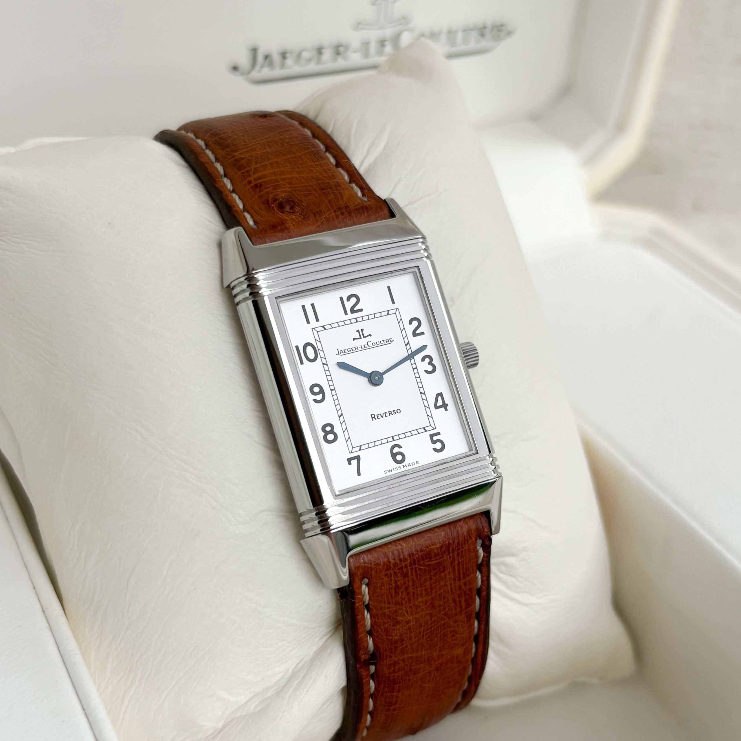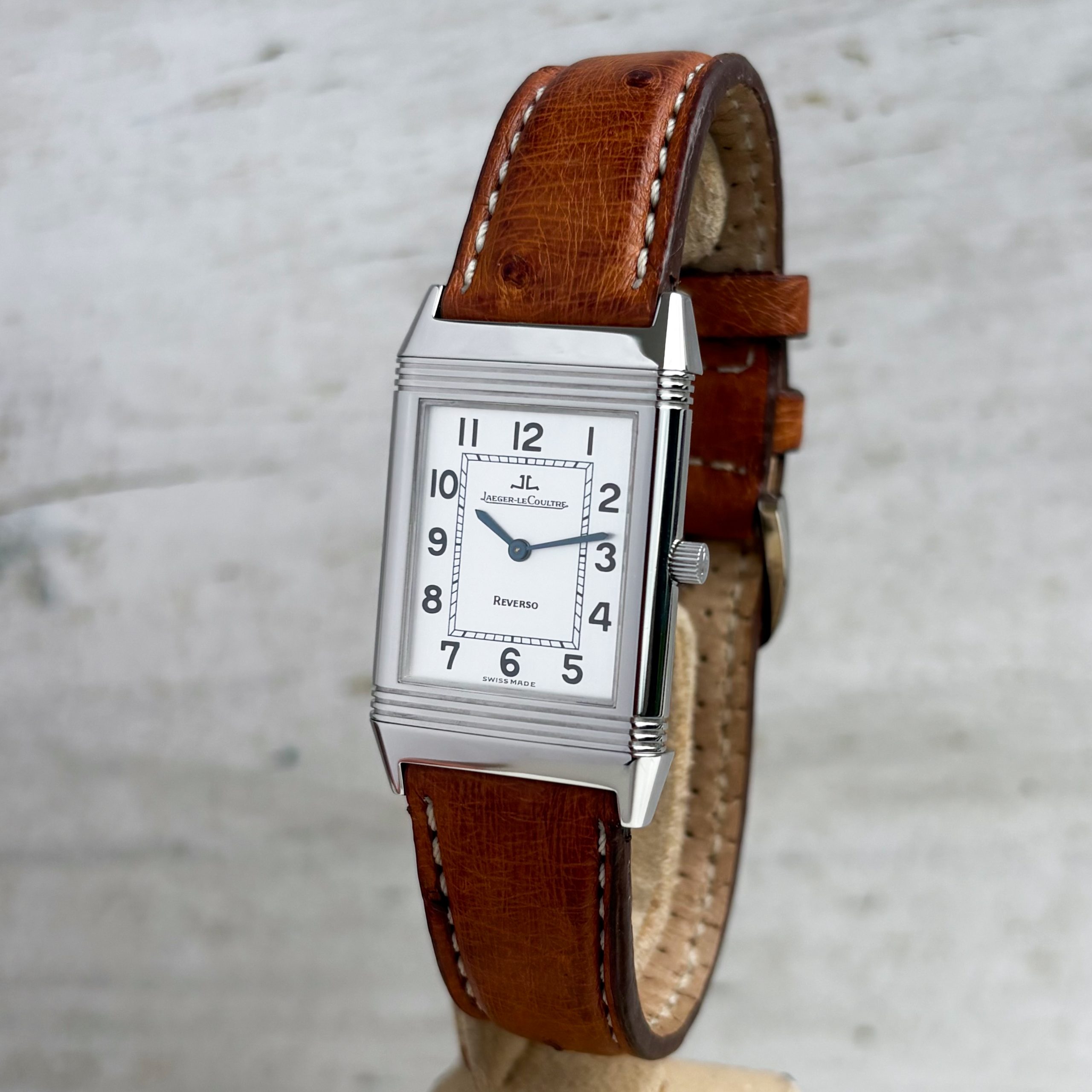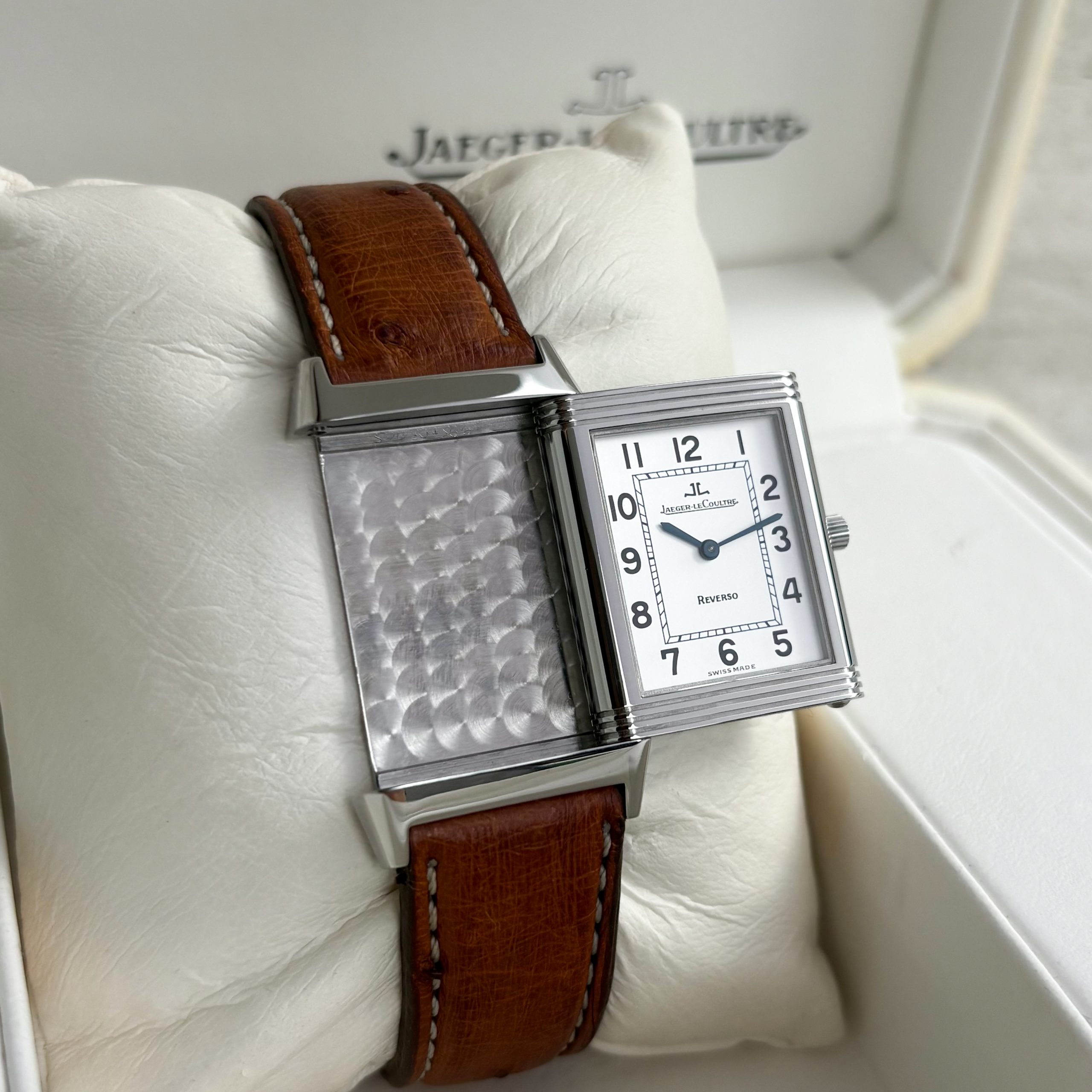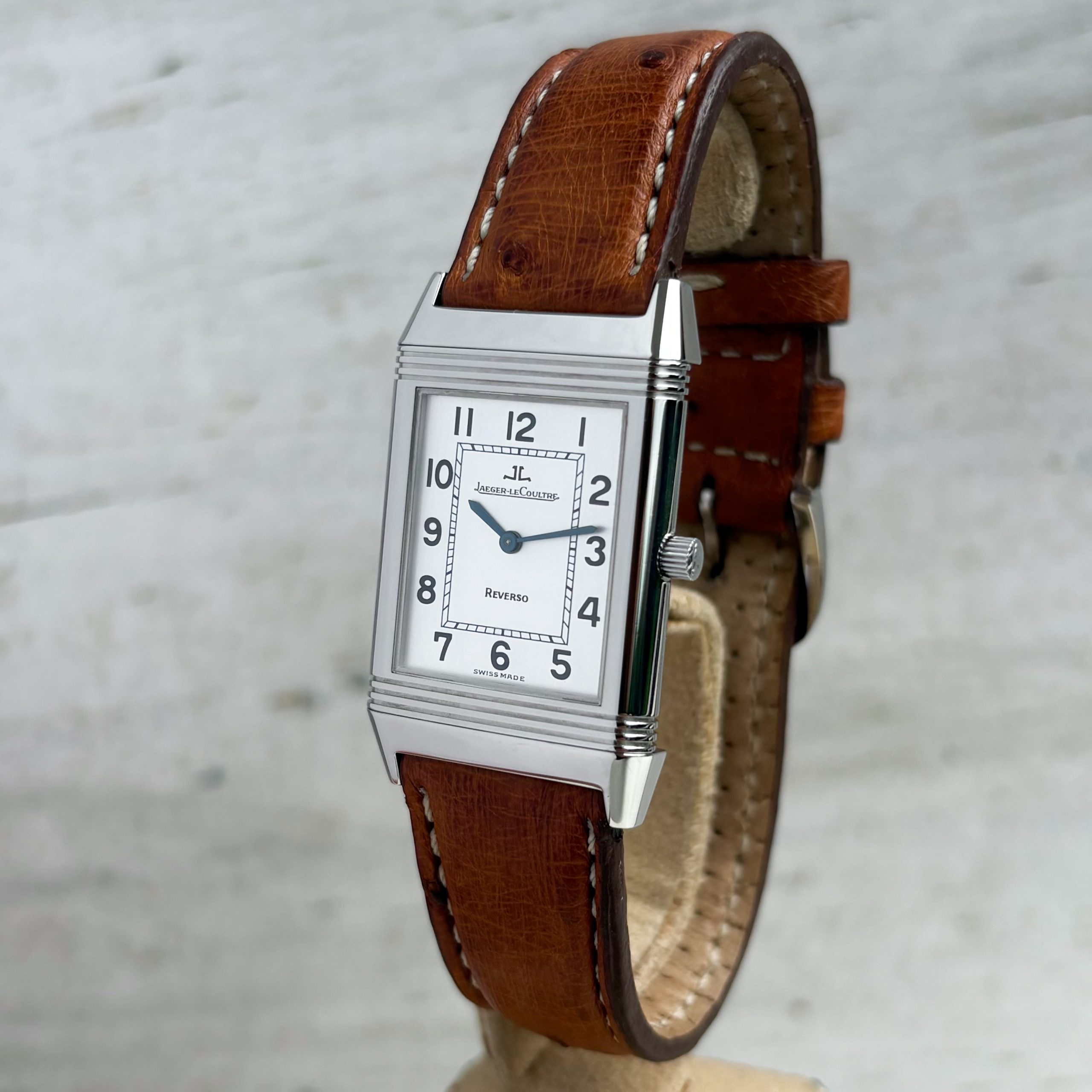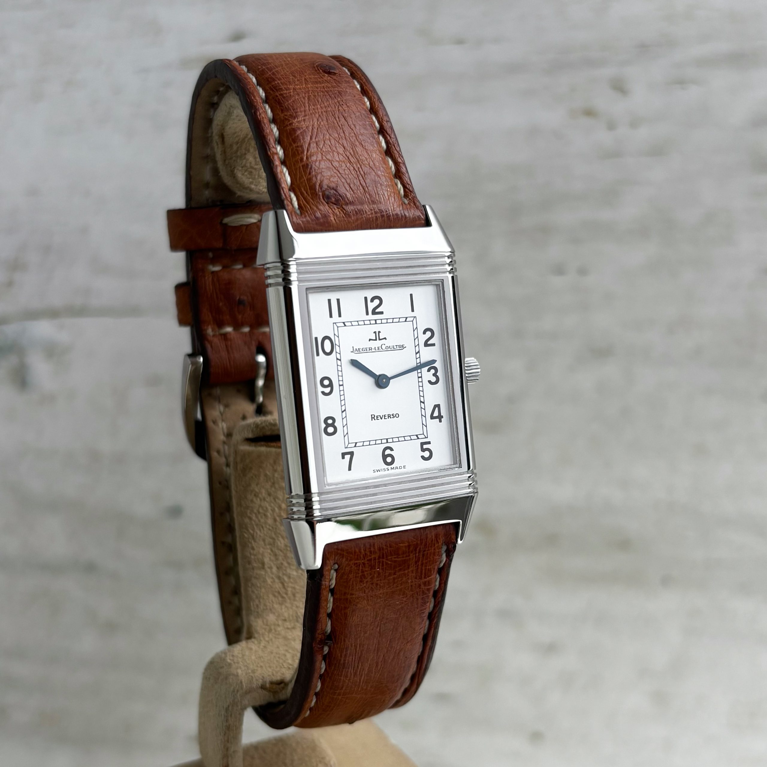 Marke: Jaeger LeCoultre Modell: Reverso Ref: 250.8.86 Uhrwerk: Handaufzug Jahr: 1995 Gehäuse: Stahl Zifferblatt: Silber Glas: Saphirglas Armband: Leder Armband (Neutral) Braun Schließe: JL Dornschließe Stahl Krone: JL Krone Funktion: Stunde, Minute Box: Jaeger-LeCoultre Uhrenbox Papiere: Jaeger-LeCoultre Papiere Technischer Zustand: Sehr guter Zustand Optischer Zustand: Sehr guter Zustand Garantie: Ein Jahr Garantie auf die gebrauchten Uhren