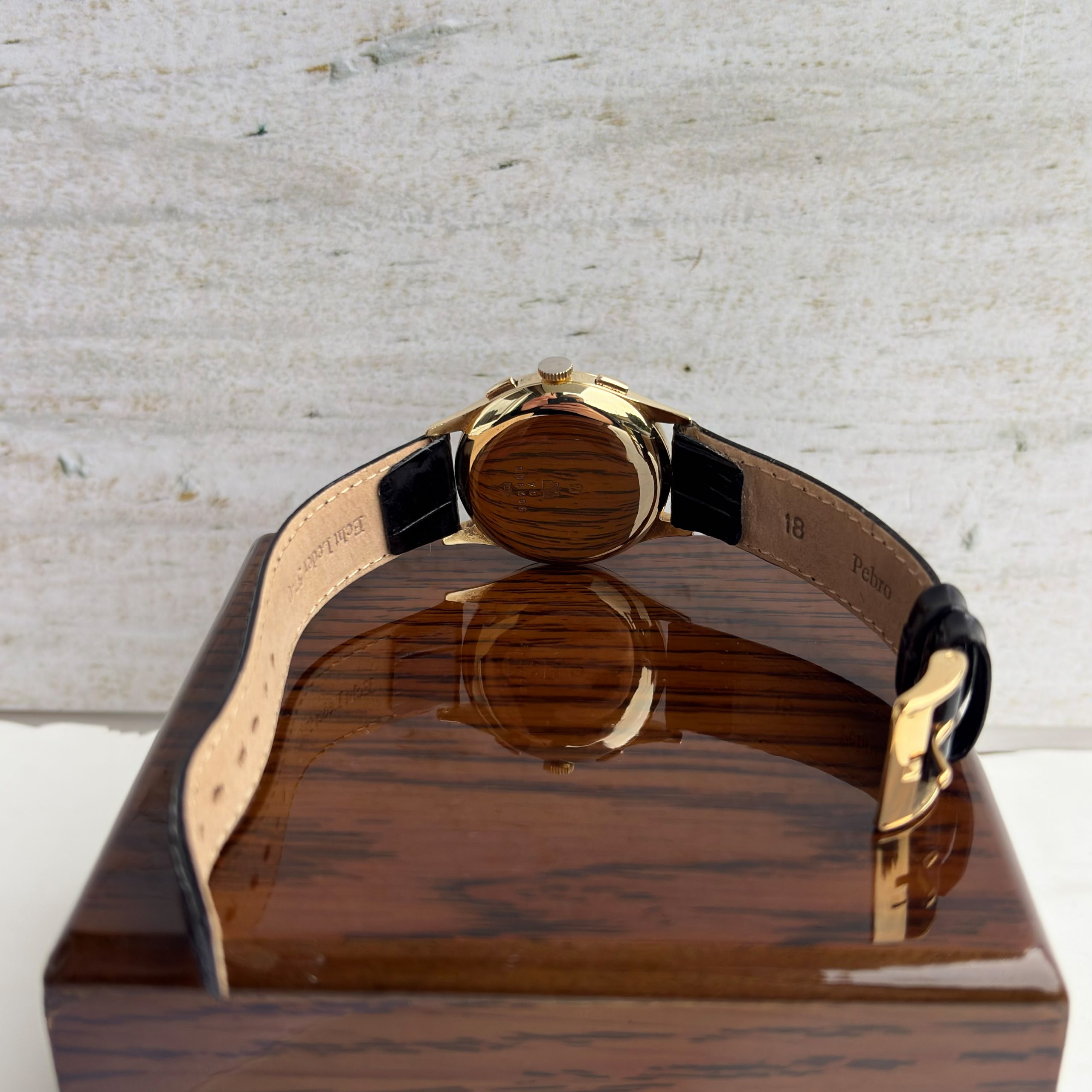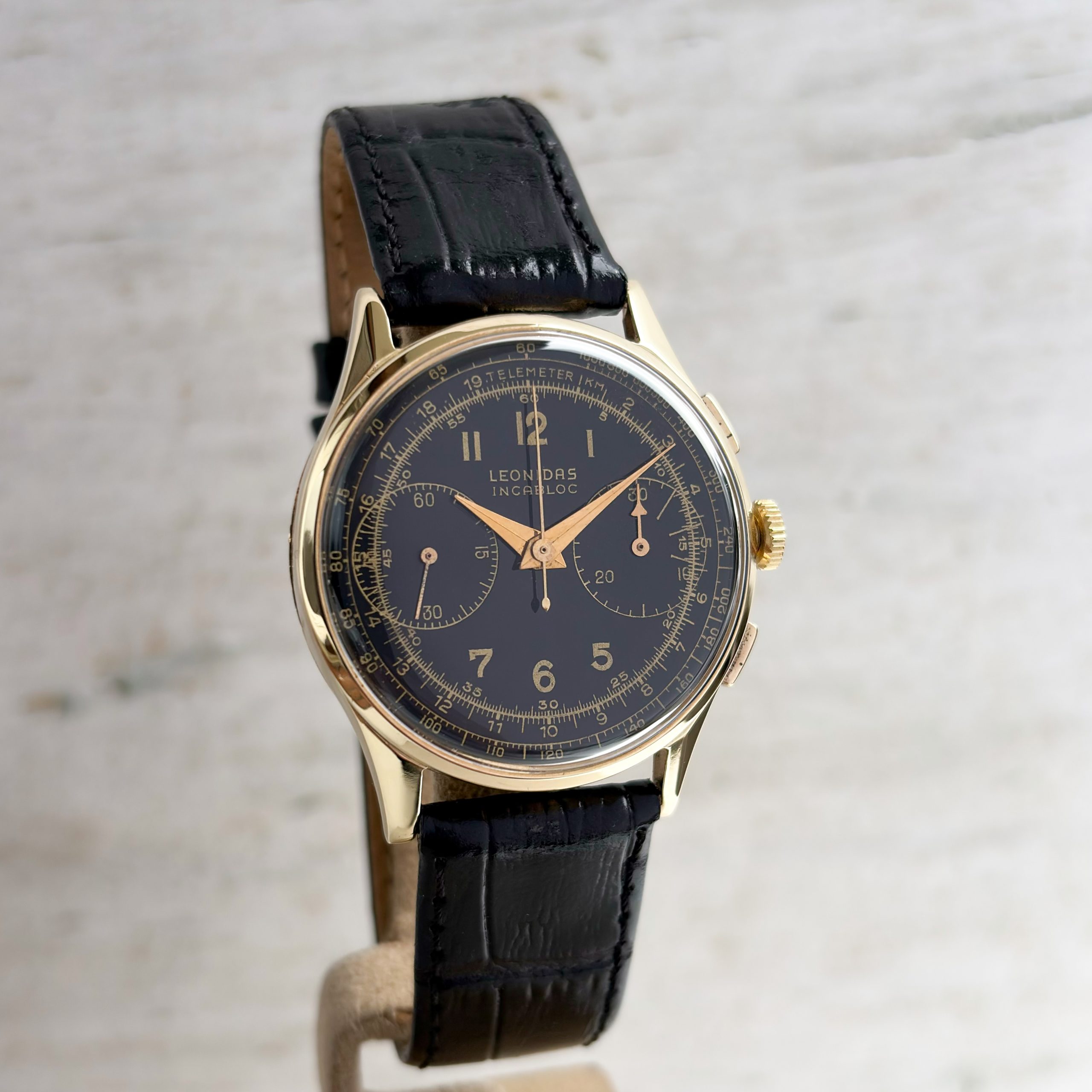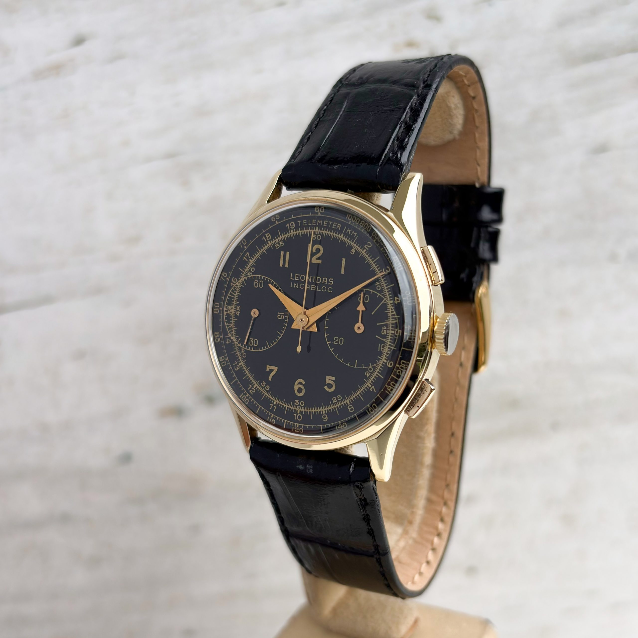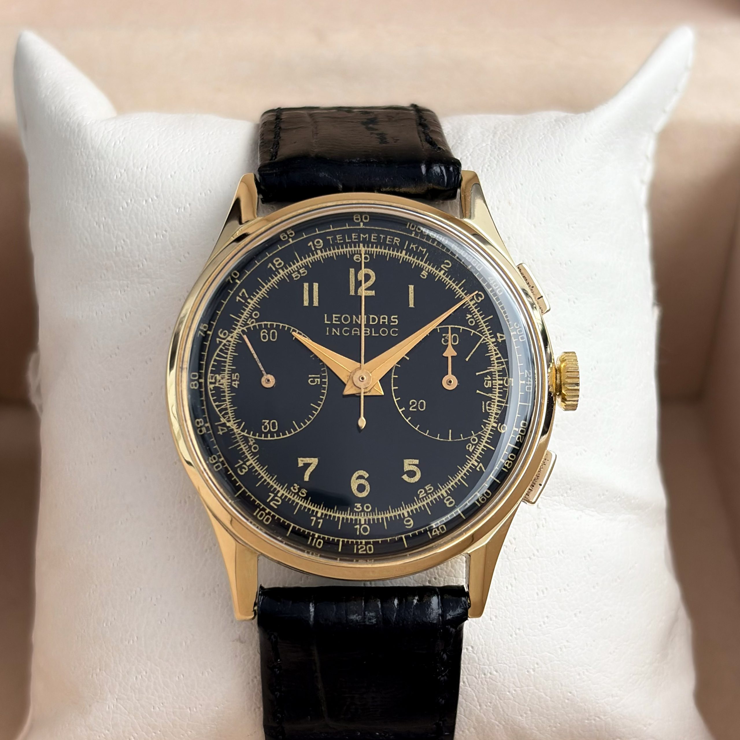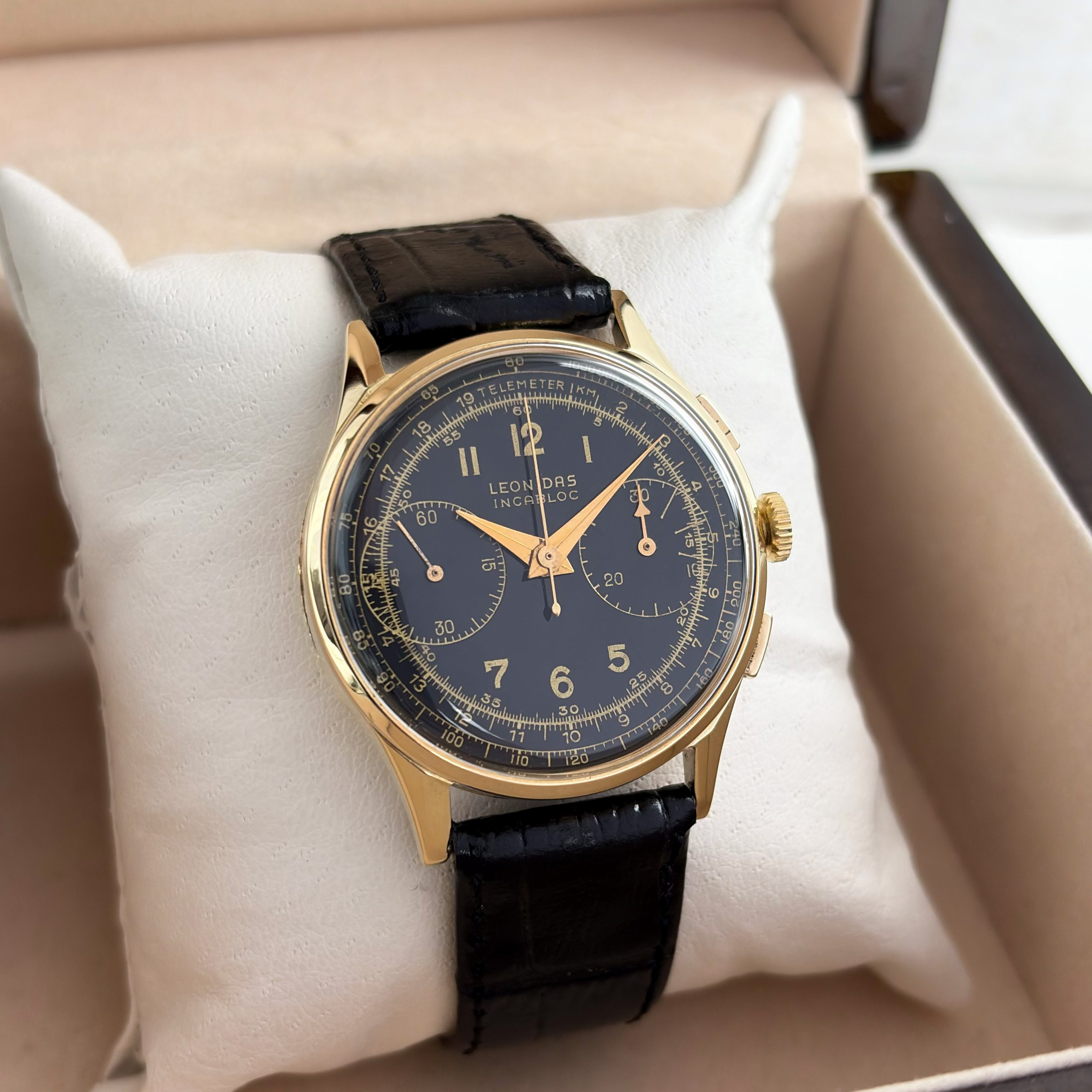 Marke: Leonidas Modell: Chronograph Ref: Vintage Uhrwerk: Handaufzug Jahr: 1950 (Ungefähre Angabe) Gehäuse: 14k Gold Zifferblatt: Schwarz Glas: Plexiglas Armband: Leder Armband Schwarz Schließe: Dornschließe Stahl Krone: Leonidas Krone Funktion: Stunde, Minute, Zentralsekunde Box: Hauseigene Uhrenbox Papiere: Hauseigenes Echtheitszertifikat Technischer Zustand: Sehr guter Zustand Optischer Zustand: Sehr guter Zustand Garantie: Ein Jahr Garantie auf die gebrauchten Uhren