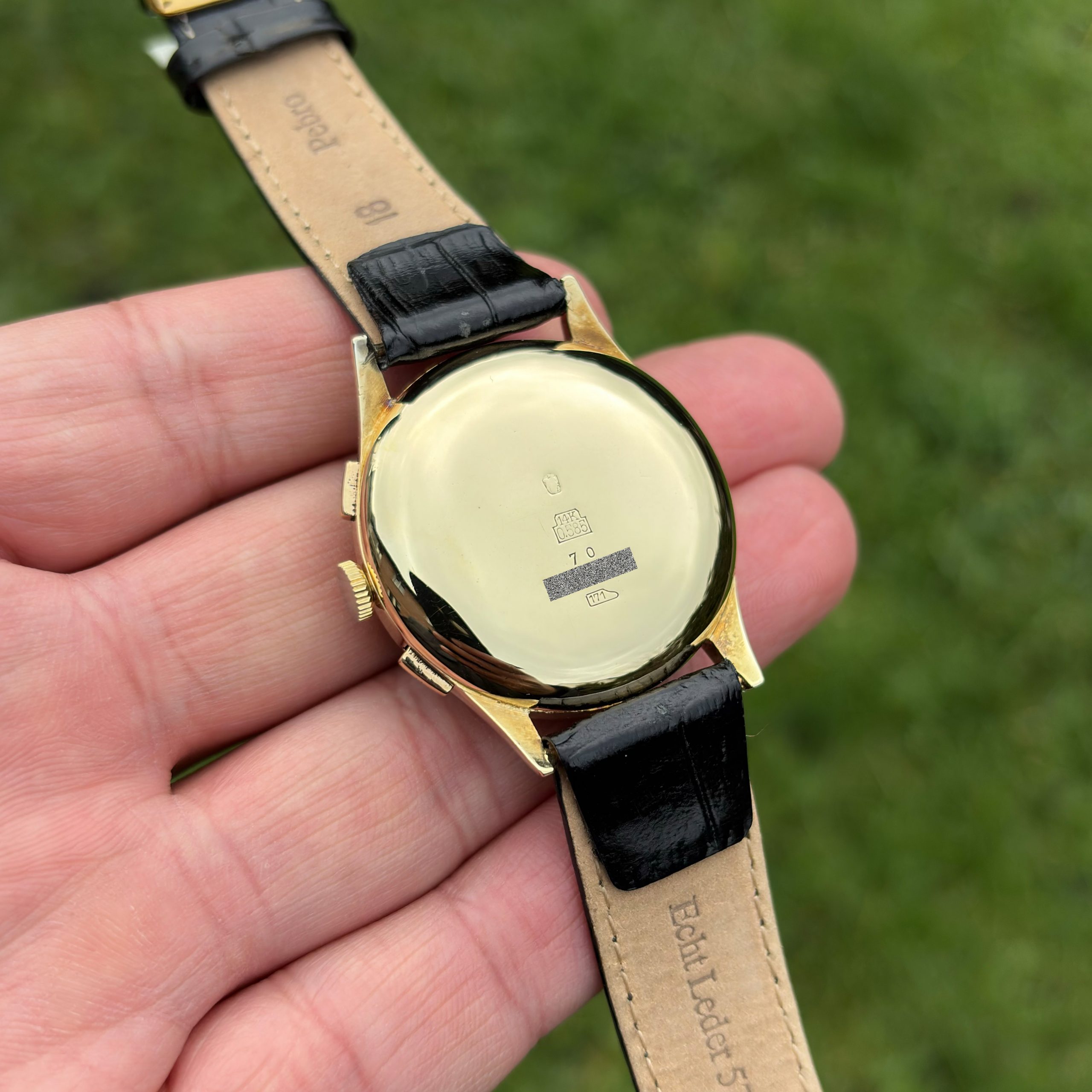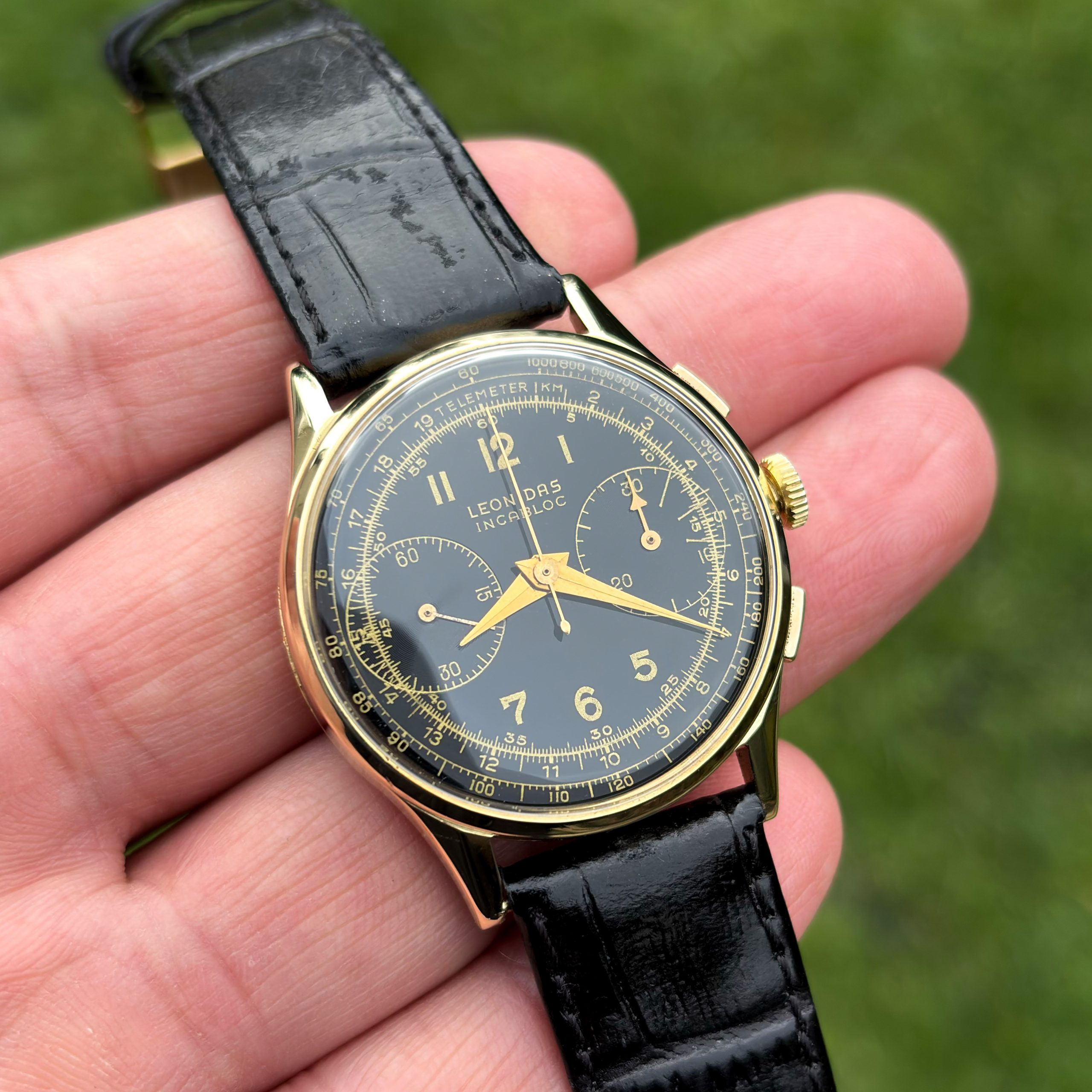 Leonidas Chronograph Gilt Dial 34mm 14k Gold Handaufzug Vintage Landeron 51 Herrenuhr