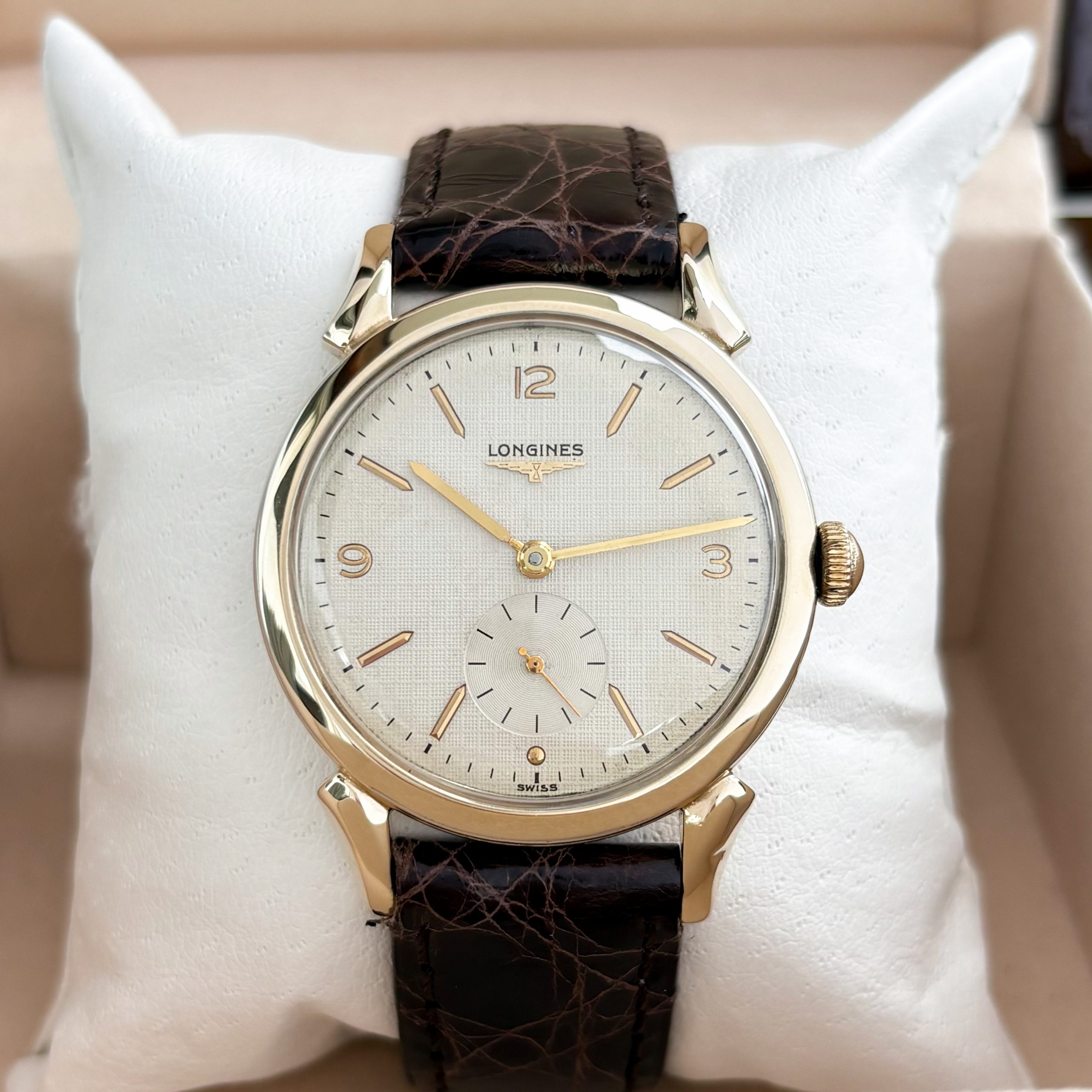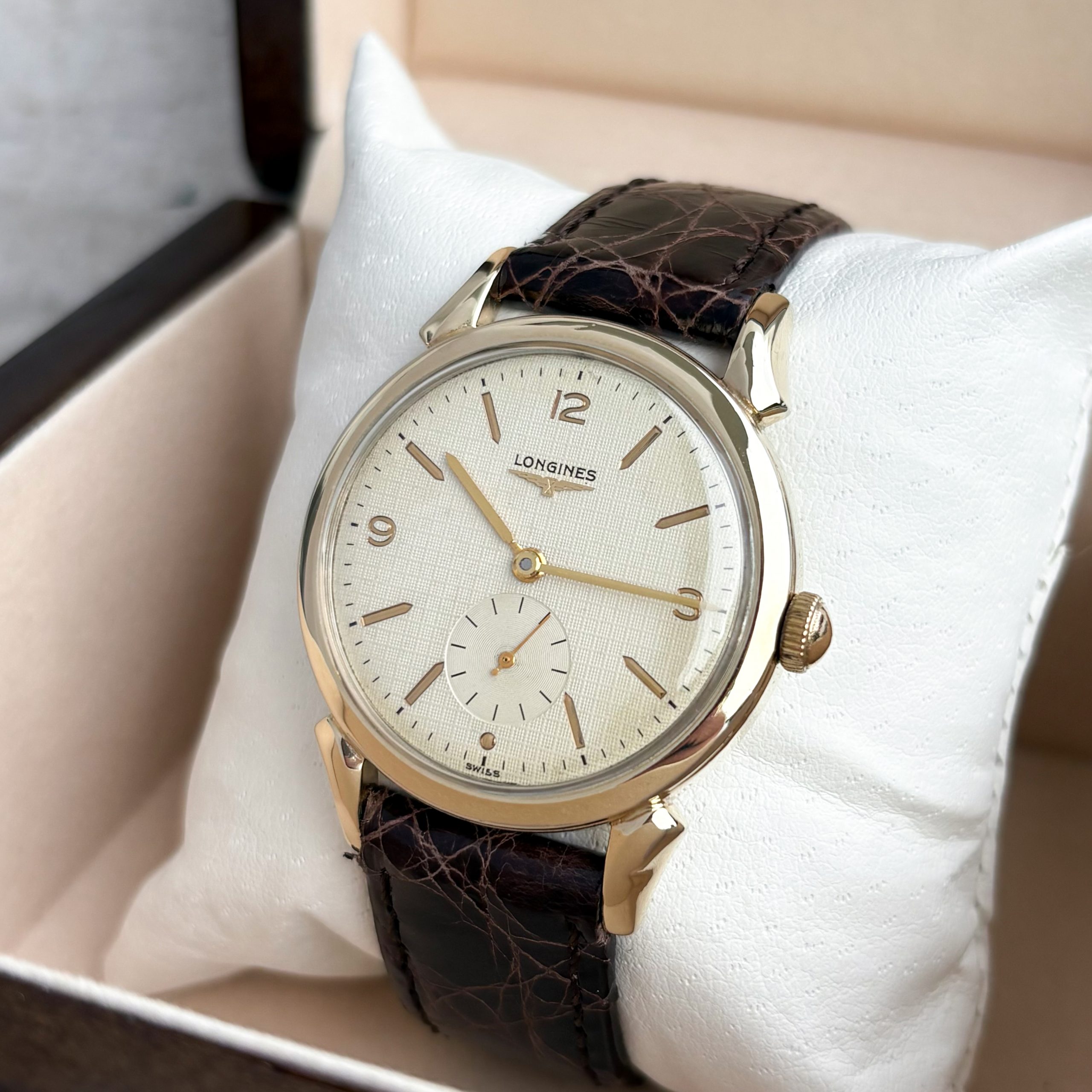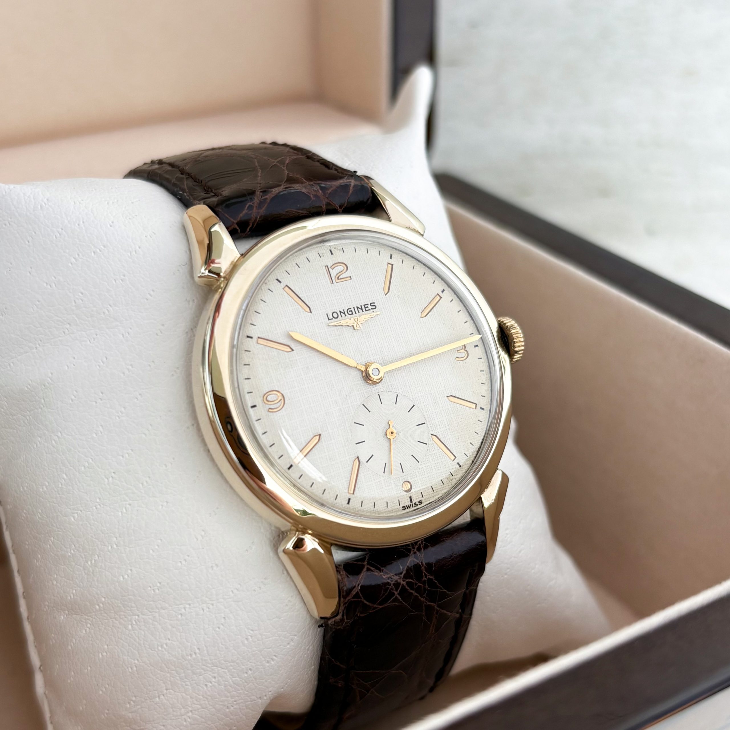 Marke: Longines Modell: Wittenauer Ref: Vintage Uhrwerk: Handaufzug Kaliber 23 Z Jahr: ca. 1940 Gehäuse: Stahl (Vergoldet) Lünette: Stahl (Vergoldet) Zifferblatt: Silber Glas: Plexiglas Armband: Lederarmband Schwarz (Neutral) Schließe: Dornschließe ( Neutral ) Krone: Stahl Krone (Neutral) Box: Hauseigene Uhrenbox Papiere: Hauseigenes Echtheitszertifikat Technischer Zustand: Sehr guter Zustand Optischer Zustand: Sehr guter Zustand Garantie: Ein Jahr Garantie auf die gebrauchten Uhren