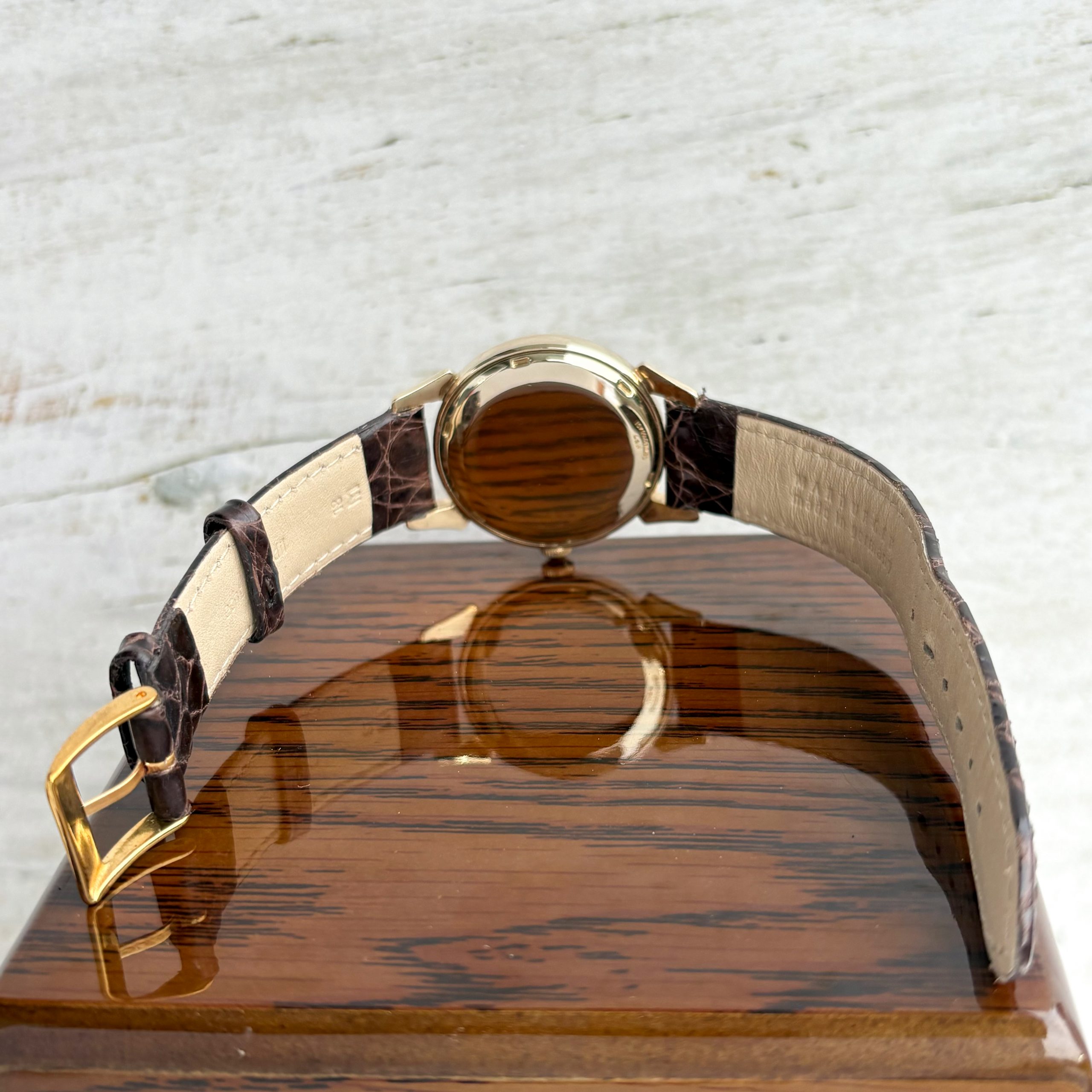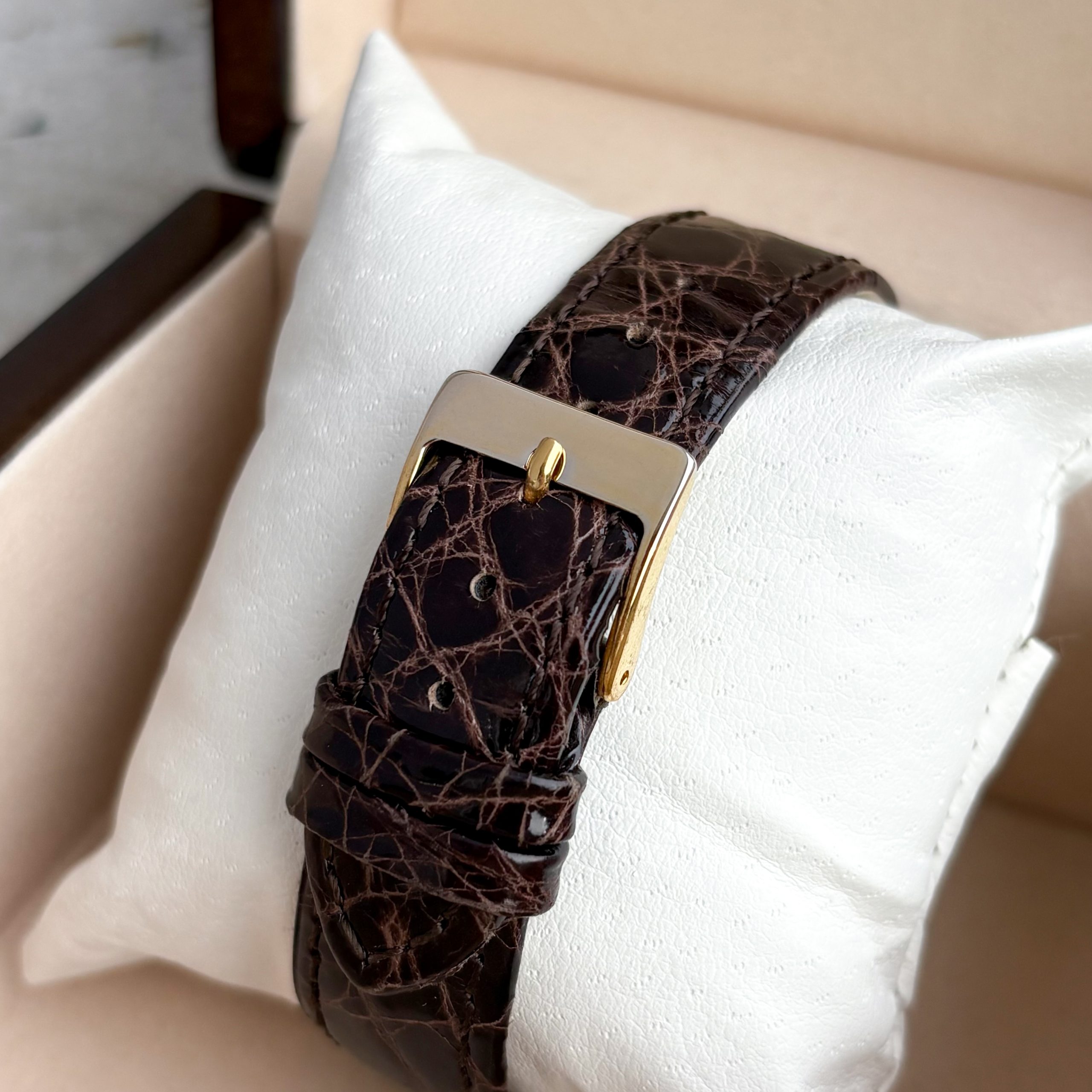 Bezel: Steel Gold Filled Dial: silver Crystal: Plexiglas Bracelet: Leather Strap ( Noname ) black Buckle: Buckle ( Noname ) Crown: (Neutral) Crown Box: Our company's watch box Paper: A Certificate of Authenticity Working Condition: Very good Optical Condition: Very good Warranty: One-year warranty on used watches