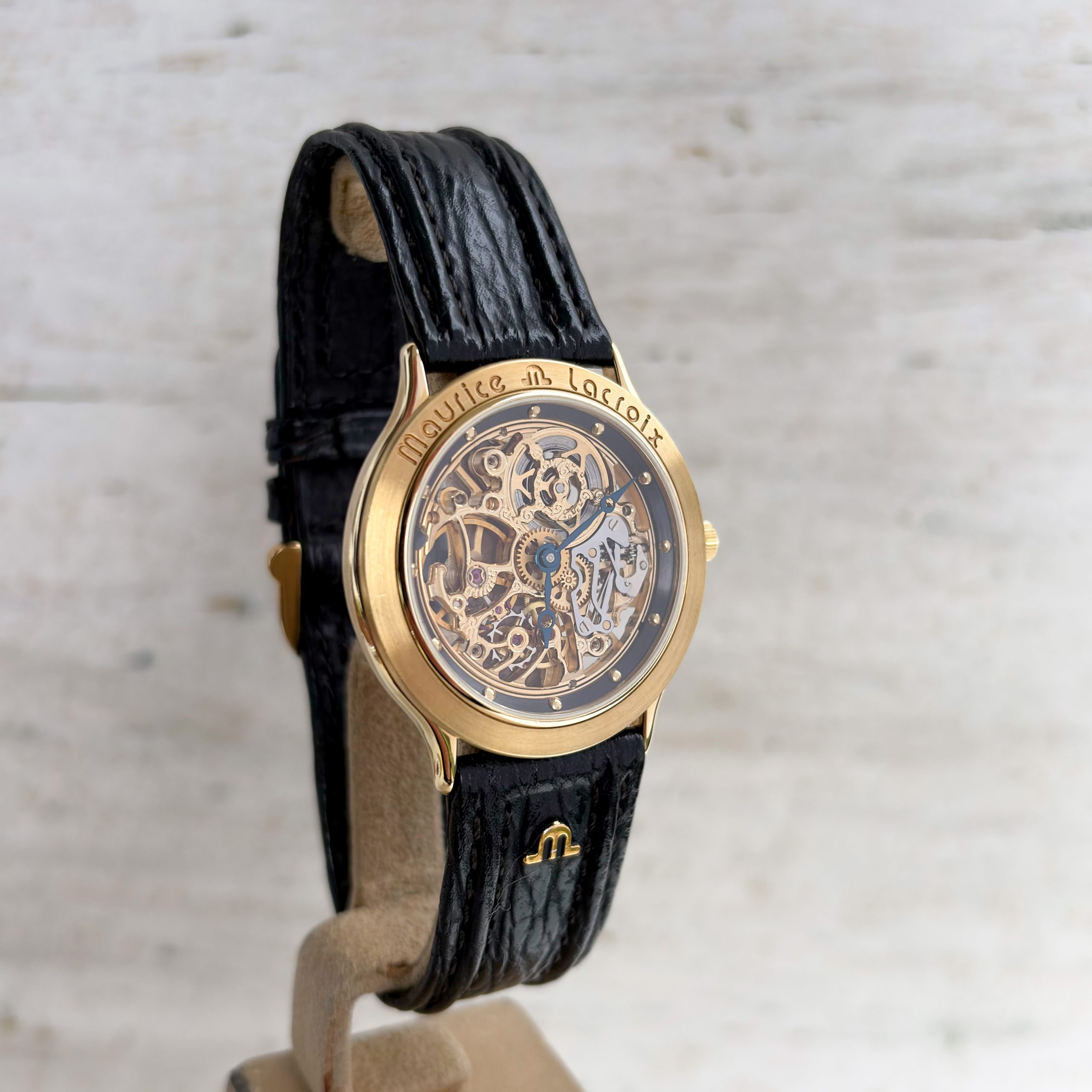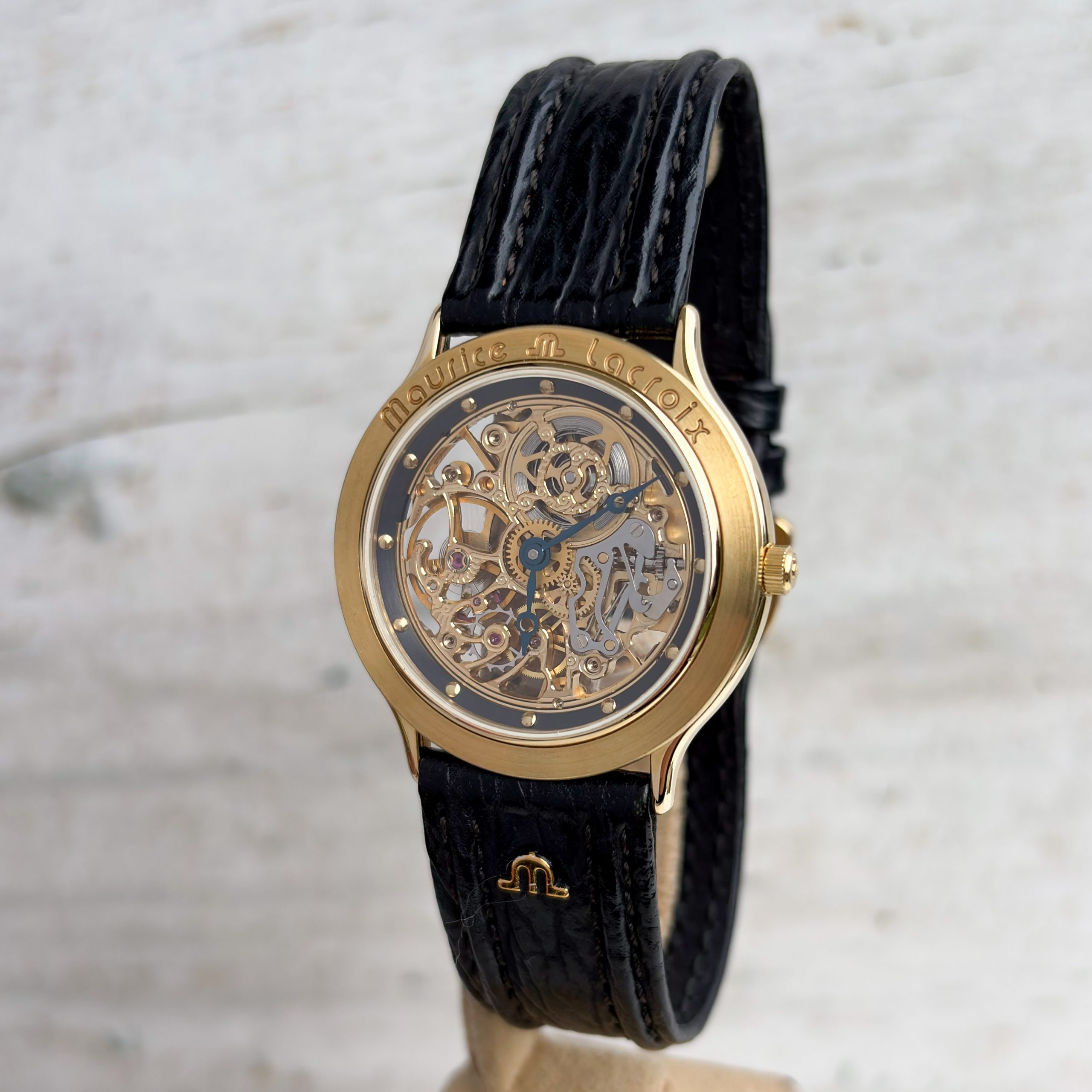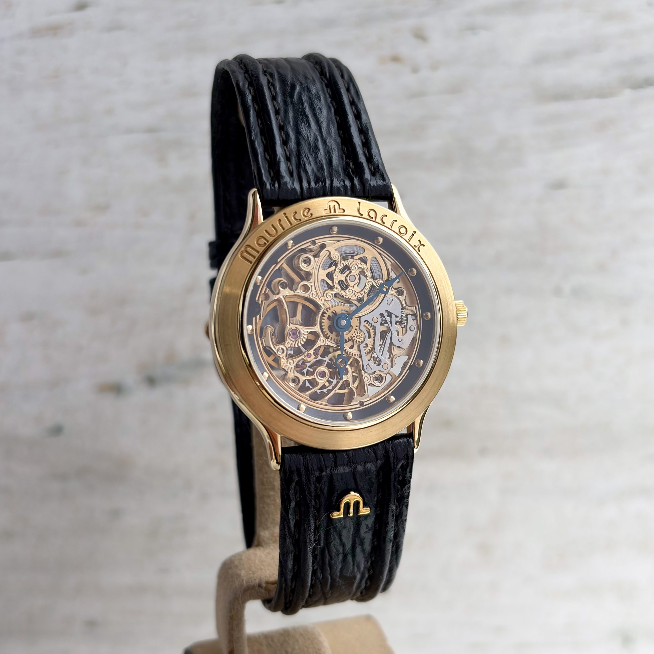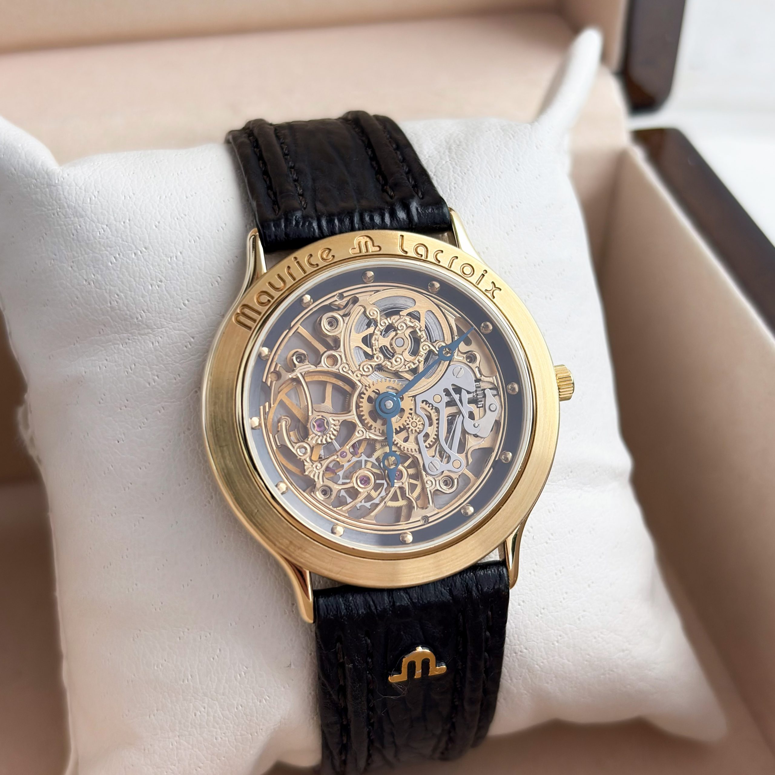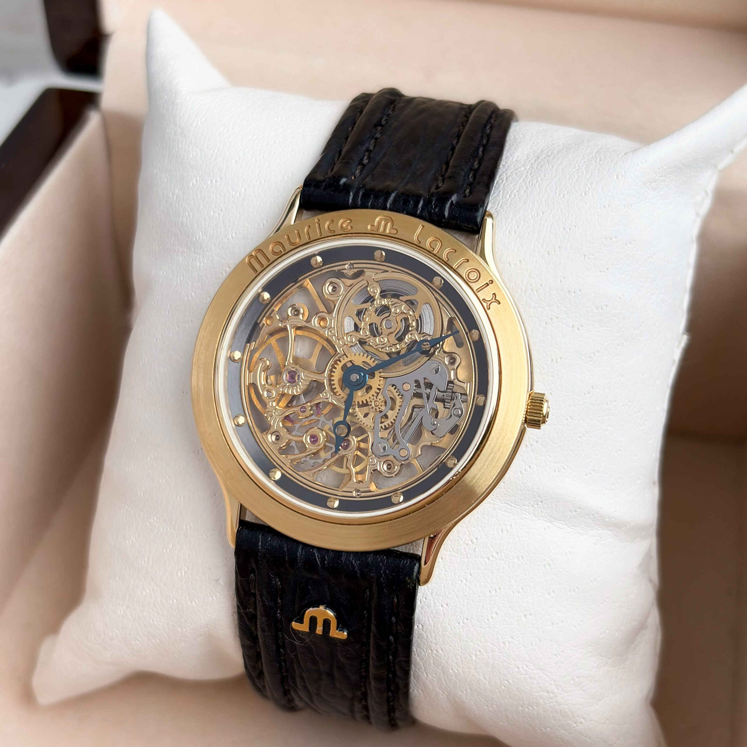 ENG Dial: gold Skeleton Crystal: Saphirglas Strap: Maurice Lacroix Leather Strap Black Crown: Maurice Lacroix Crown Box: Our company's watch box Paper: Certificate of Authenticity Working Condition: Very Good Optical Condition: Very Good Warranty: One-year warranty on used watches