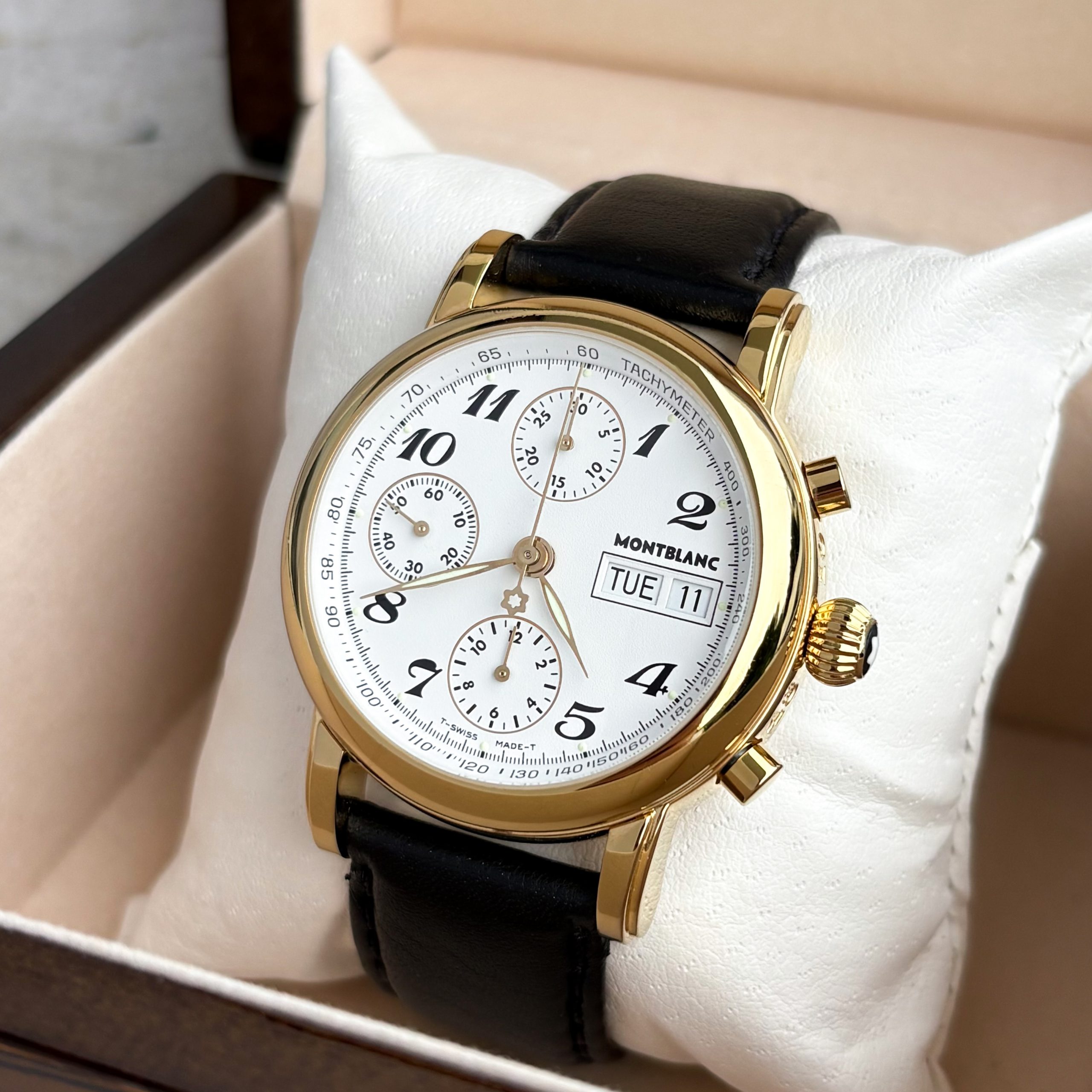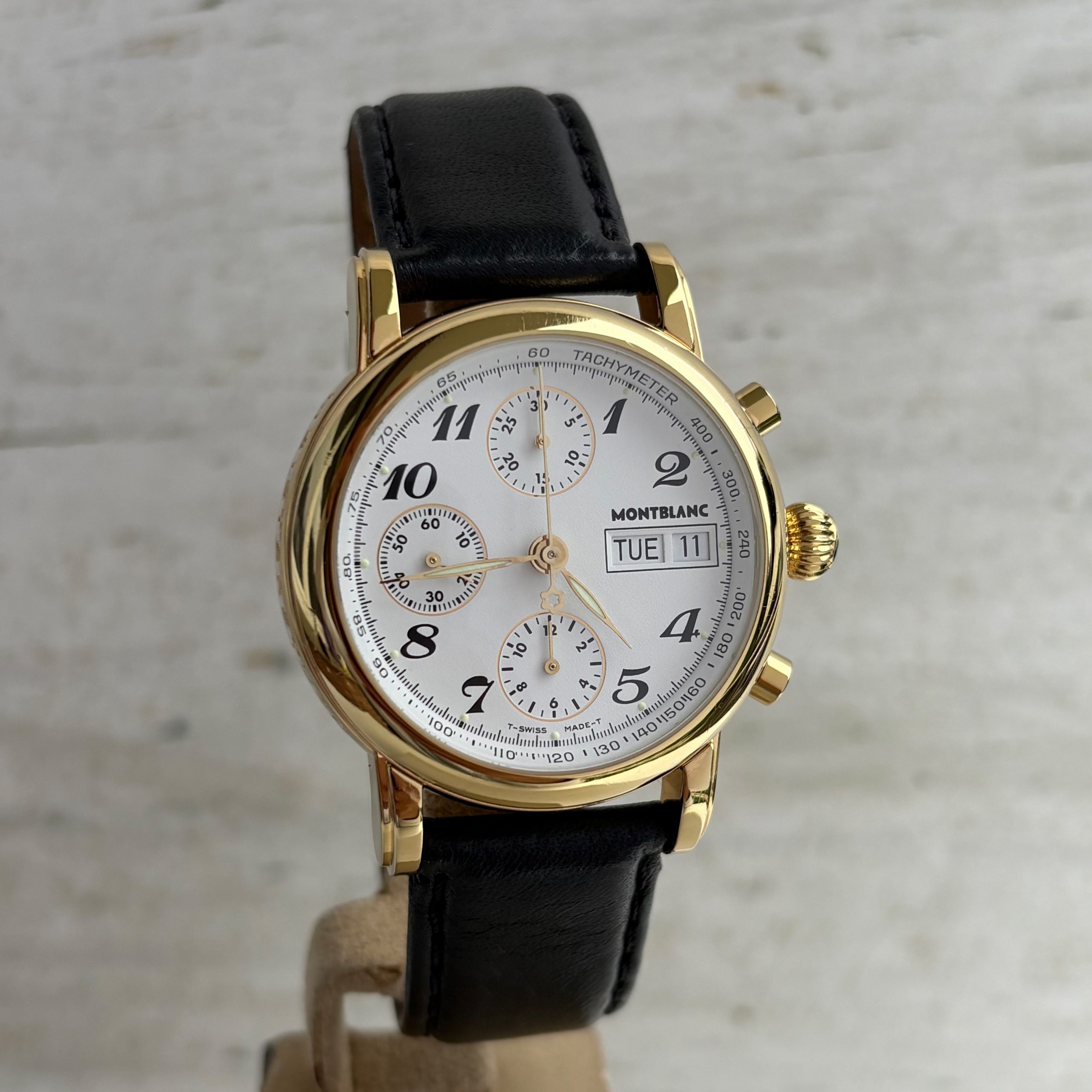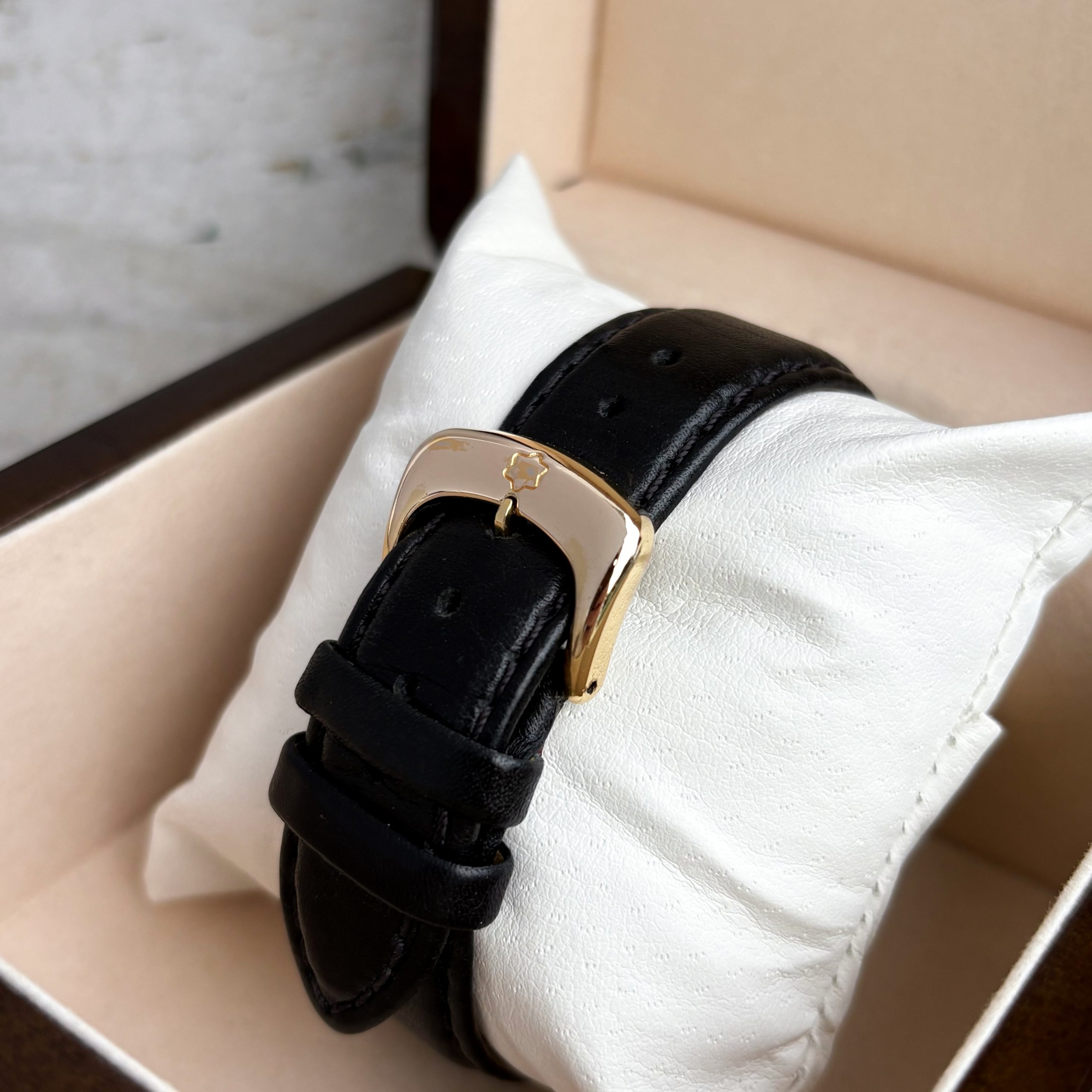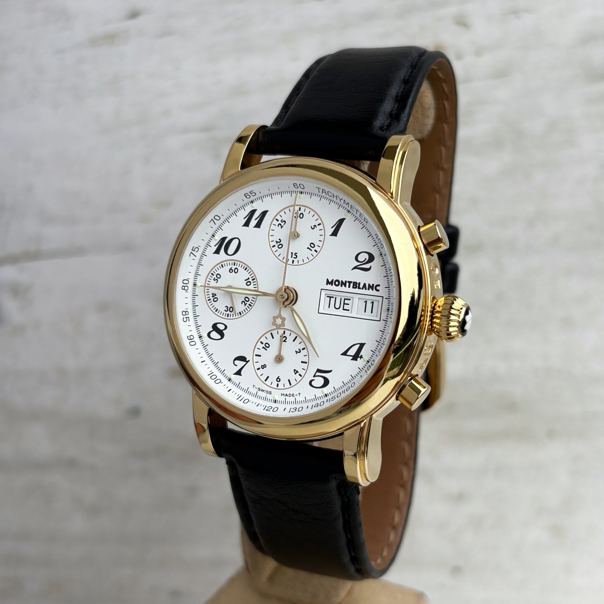 Bezel: Steel Gold Filled Dial: white Crystal: Sapphire Bracelet: Leather Strap black Buckle: Buckle ( Noname ) Crown: Montblanc Crown Box: Our company's watch box Paper: A Certificate of Authenticity Working Condition: Very good Optical Condition: Good Warranty: One-year warranty on used watches