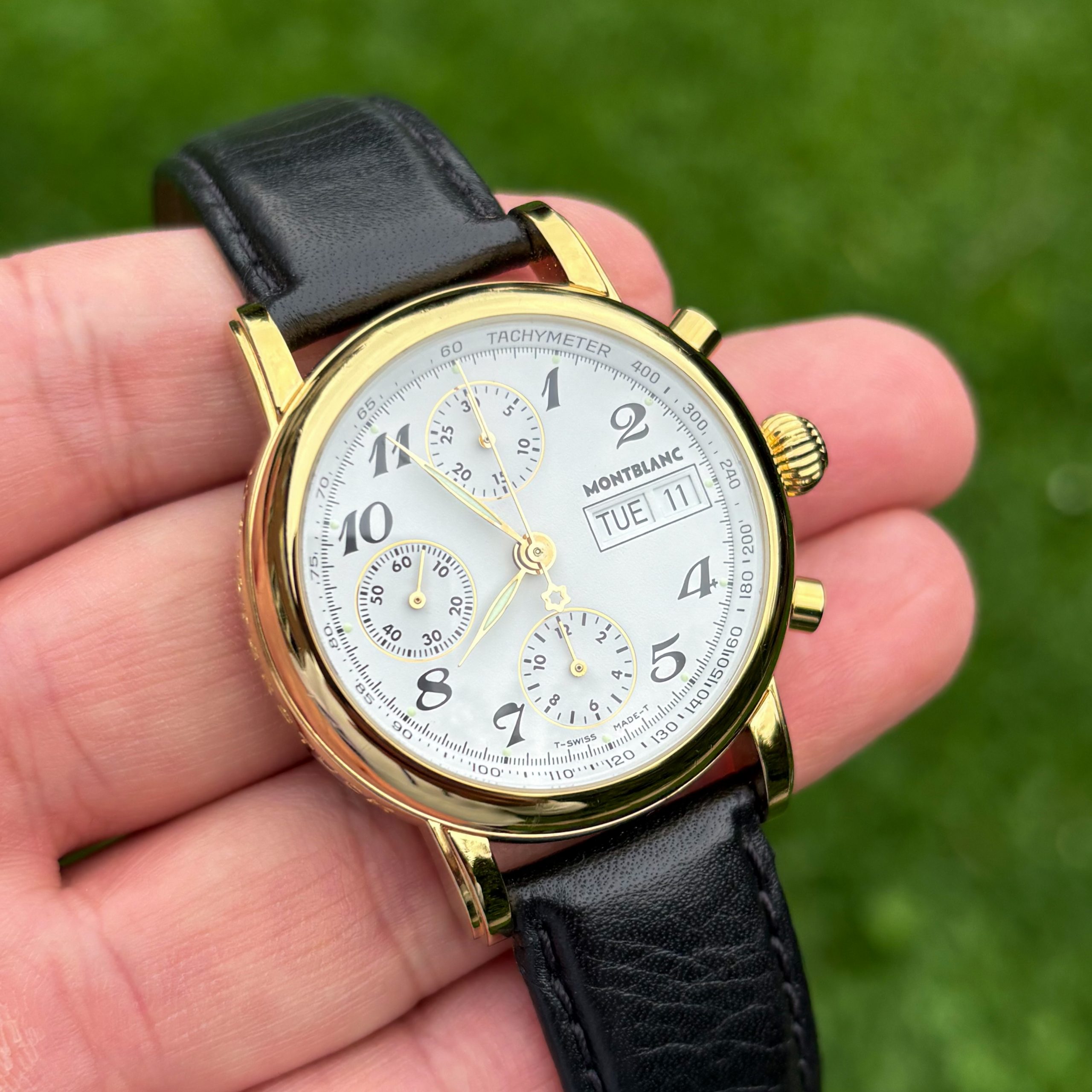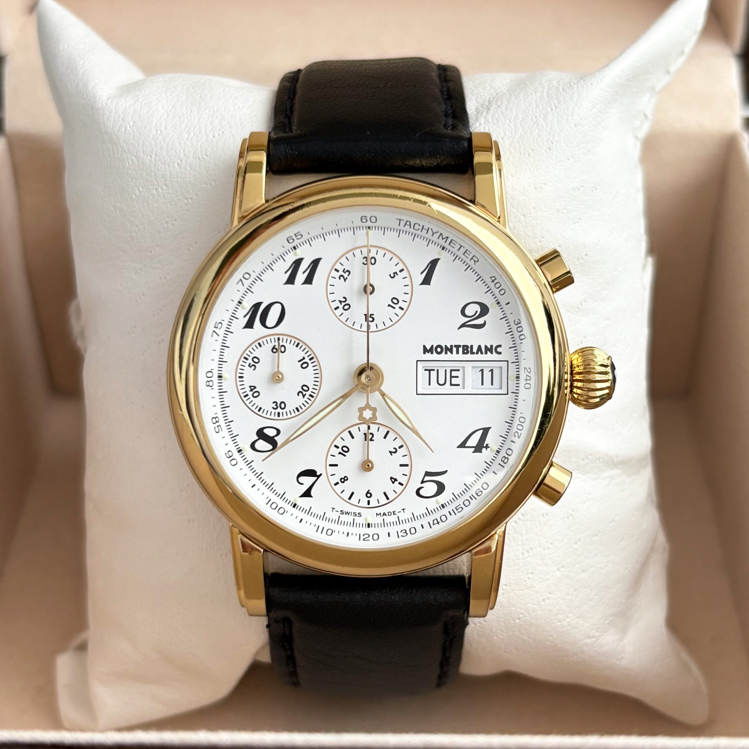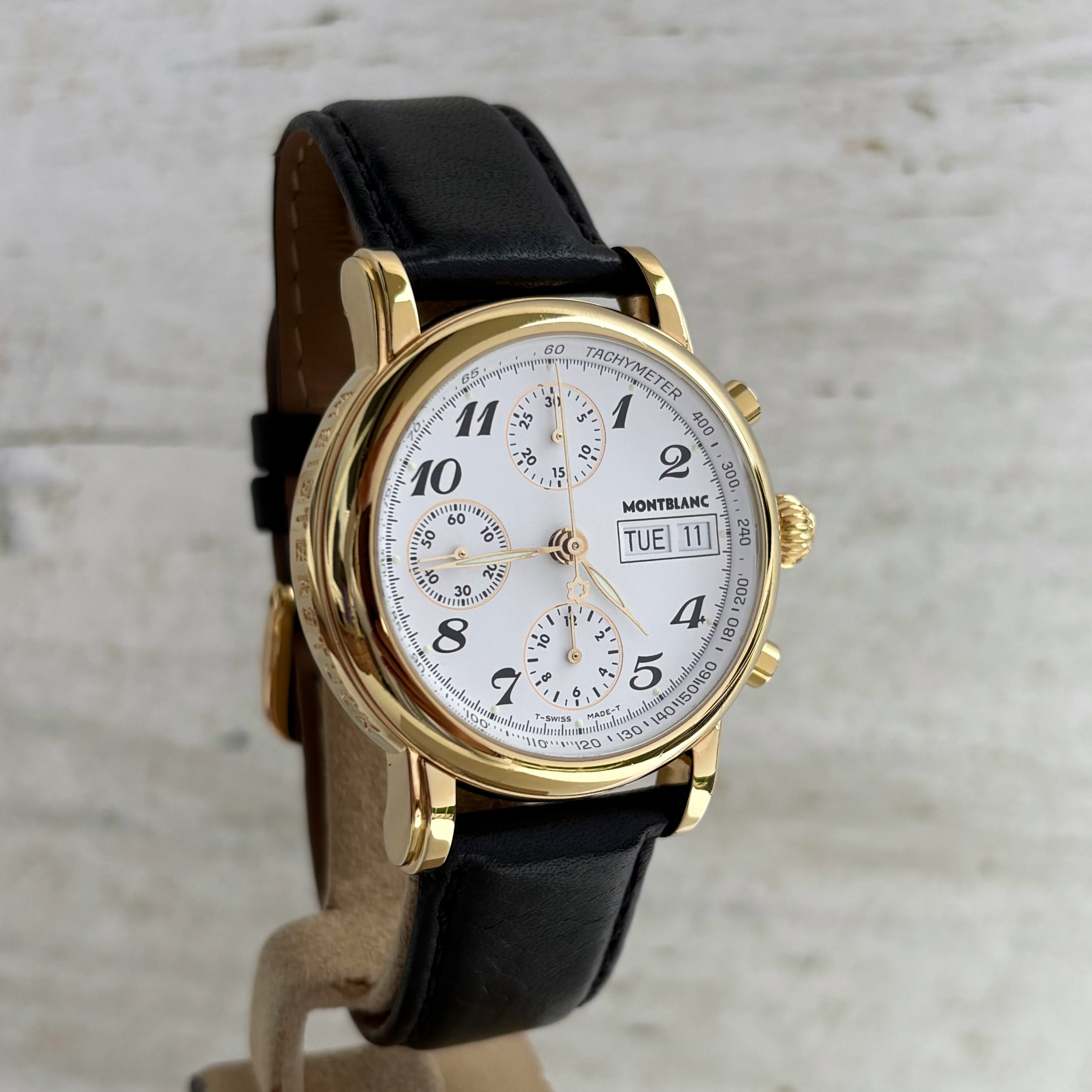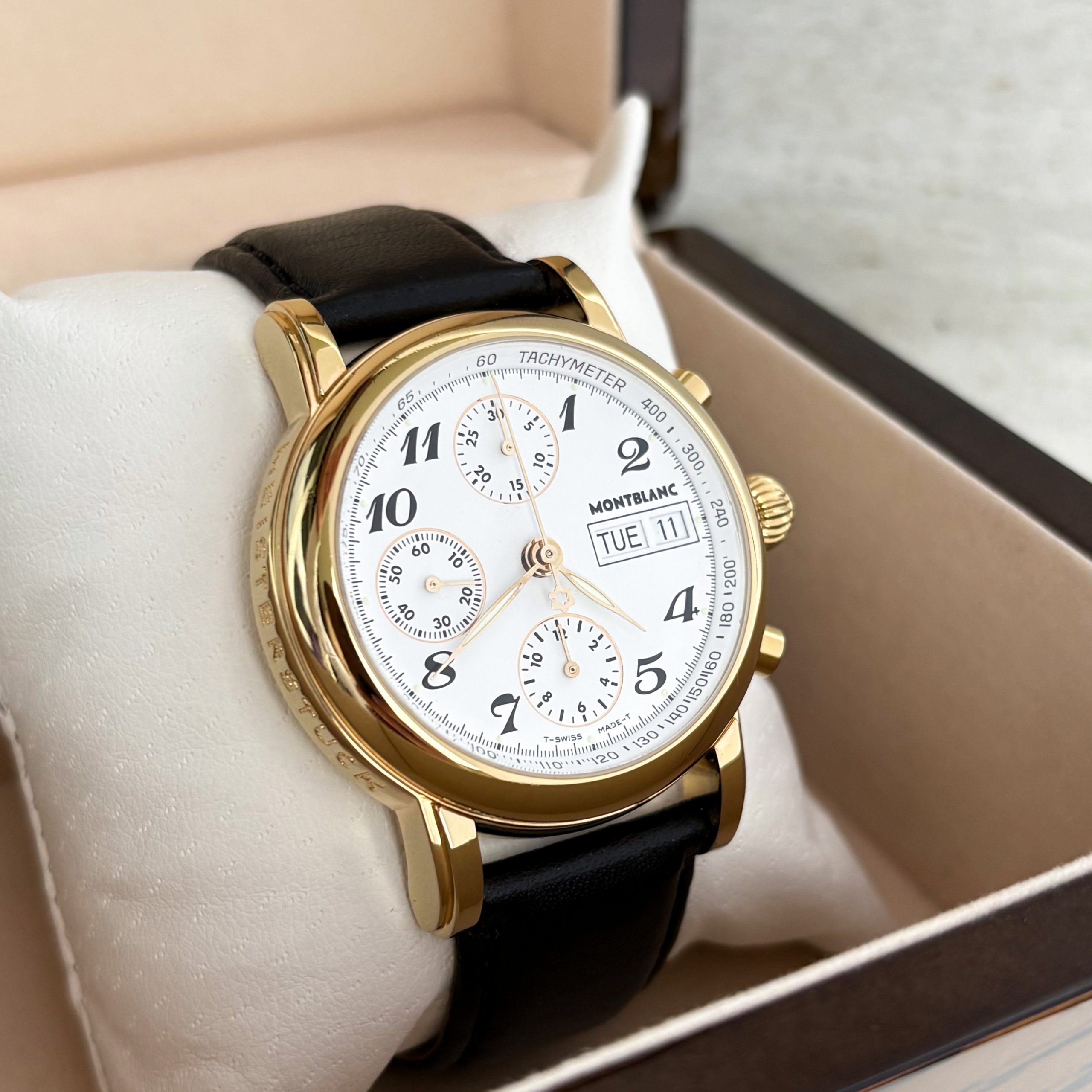 Bezel: Steel Gold Filled Dial: white Crystal: Sapphire Bracelet: Leather Strap black Buckle: Buckle ( Noname ) Crown: Montblanc Crown Box: Our company's watch box Paper: A Certificate of Authenticity Working Condition: Very good Optical Condition: Good Warranty: One-year warranty on used watches