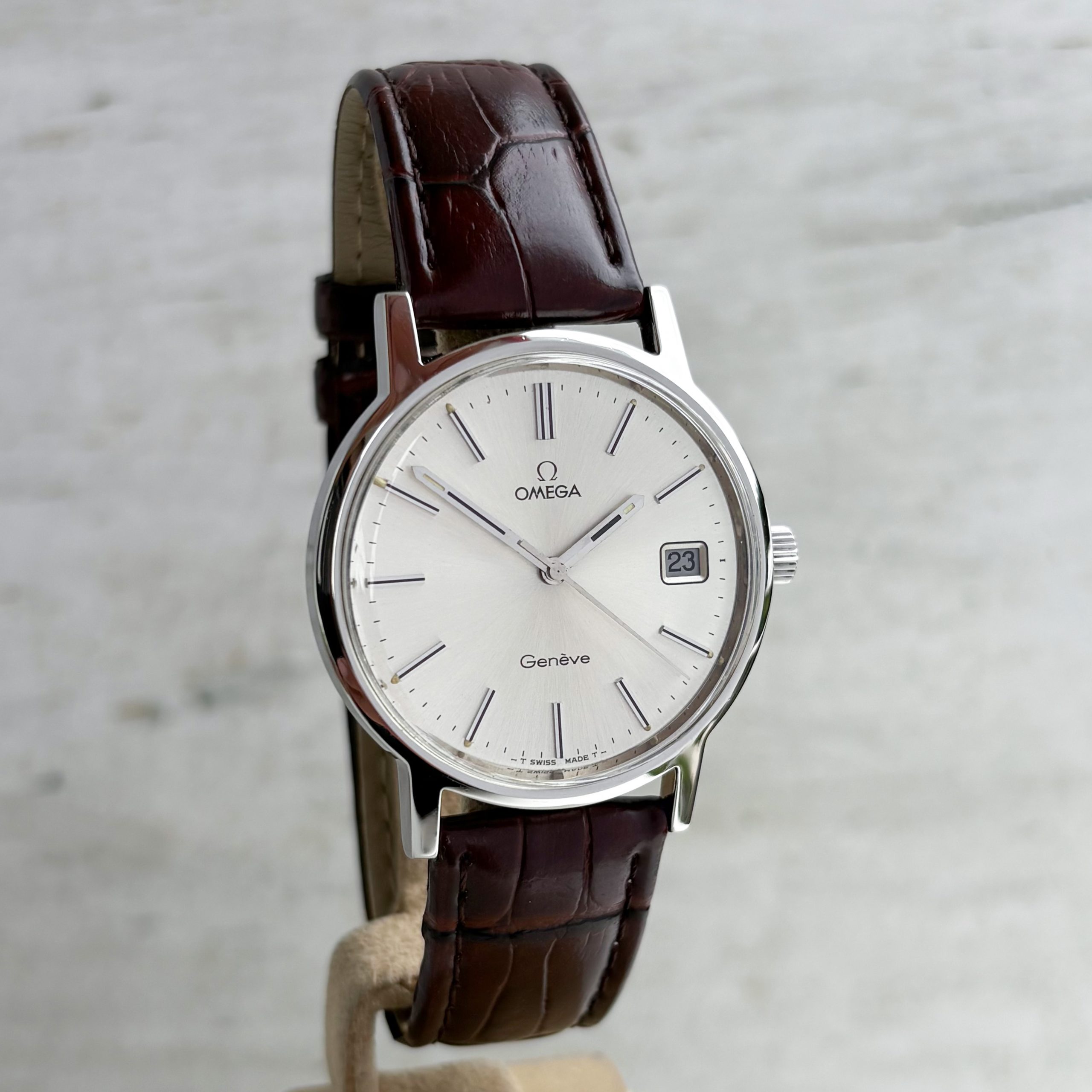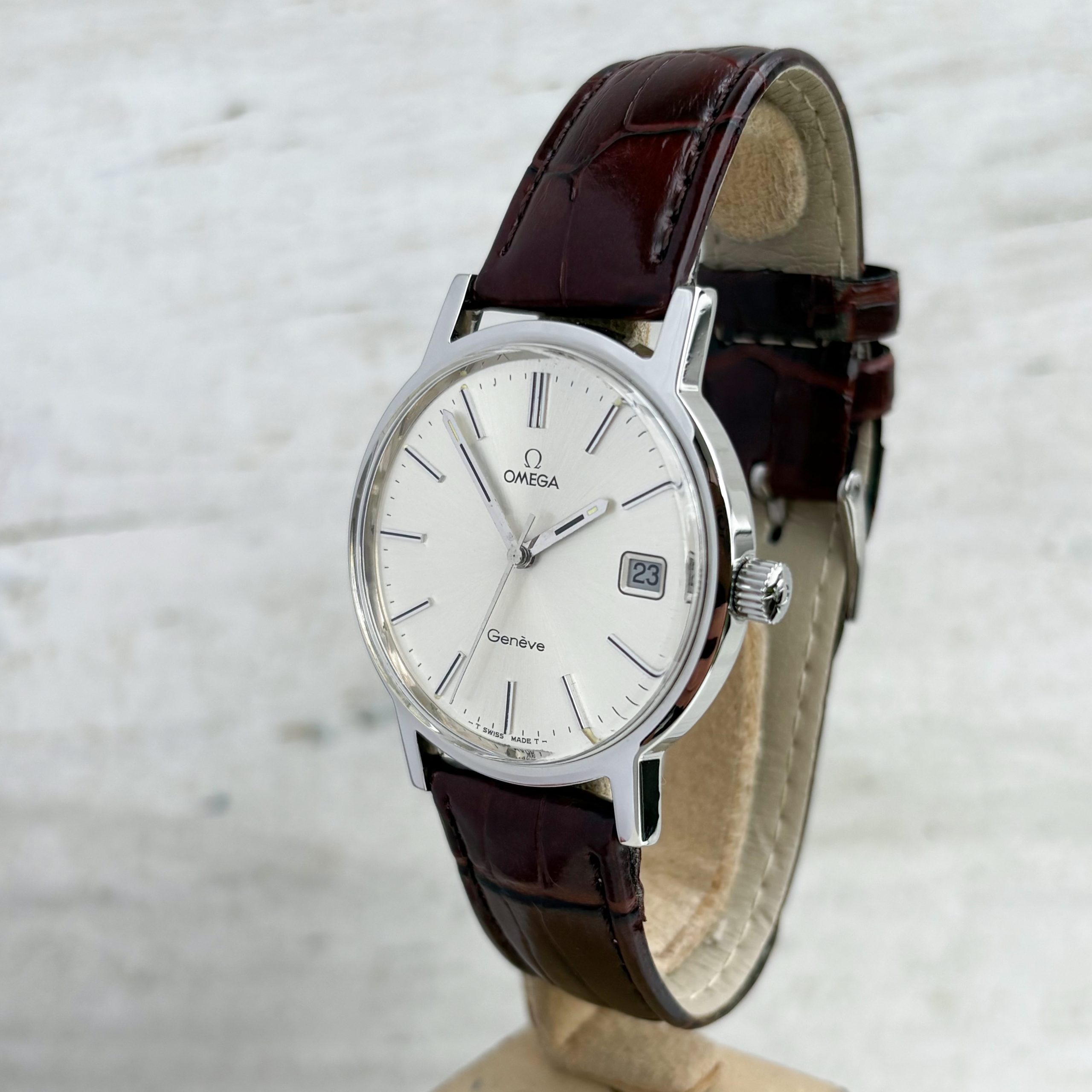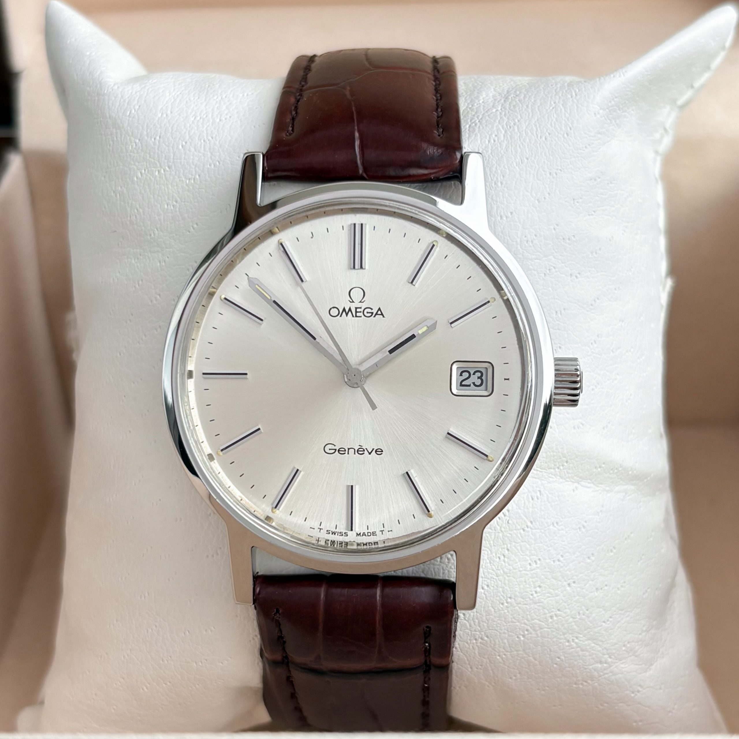 Marke: Omega Modell: Geneve Ref: 136.0104 Uhrwerk: Handaufzug Kal. 1030 Jahr: ca. 1974 Gehäuse: Stahl Zifferblatt: Silber Glas: Plexiglas Armband: Lederarmband ( Neutral ) Braun Schließe: Dornschließe Stahl Krone: Original Omega Krone Funktion: Stunde, Minute, Zentralsekunde, Datum Box: Hauseigene Uhrenbox Papiere: Hauseigenes Echtheitszertifikat Technischer Zustand: Sehr guter Zustand Optischer Zustand: Sehr guter Zustand Garantie: Ein Jahr Garantie auf gebrauchte Uhren
