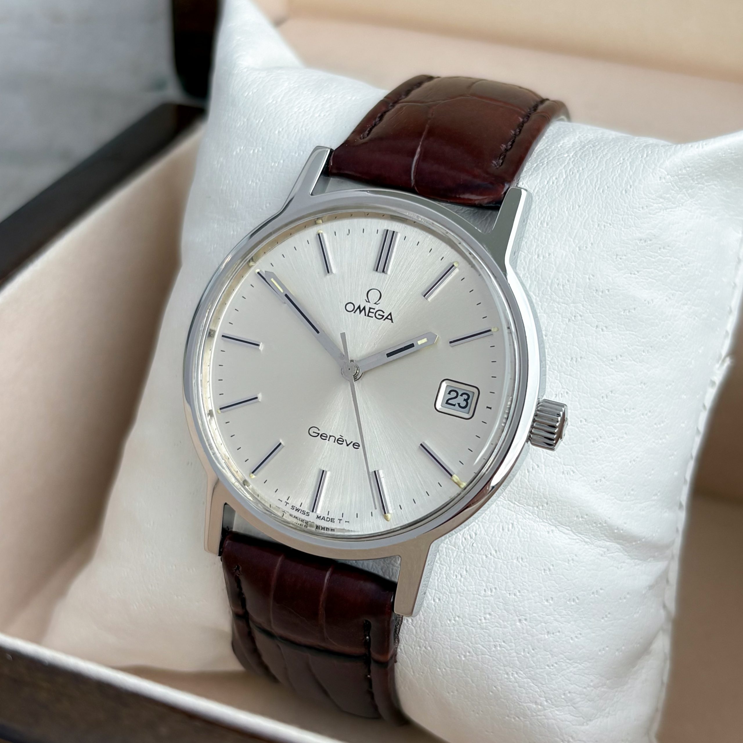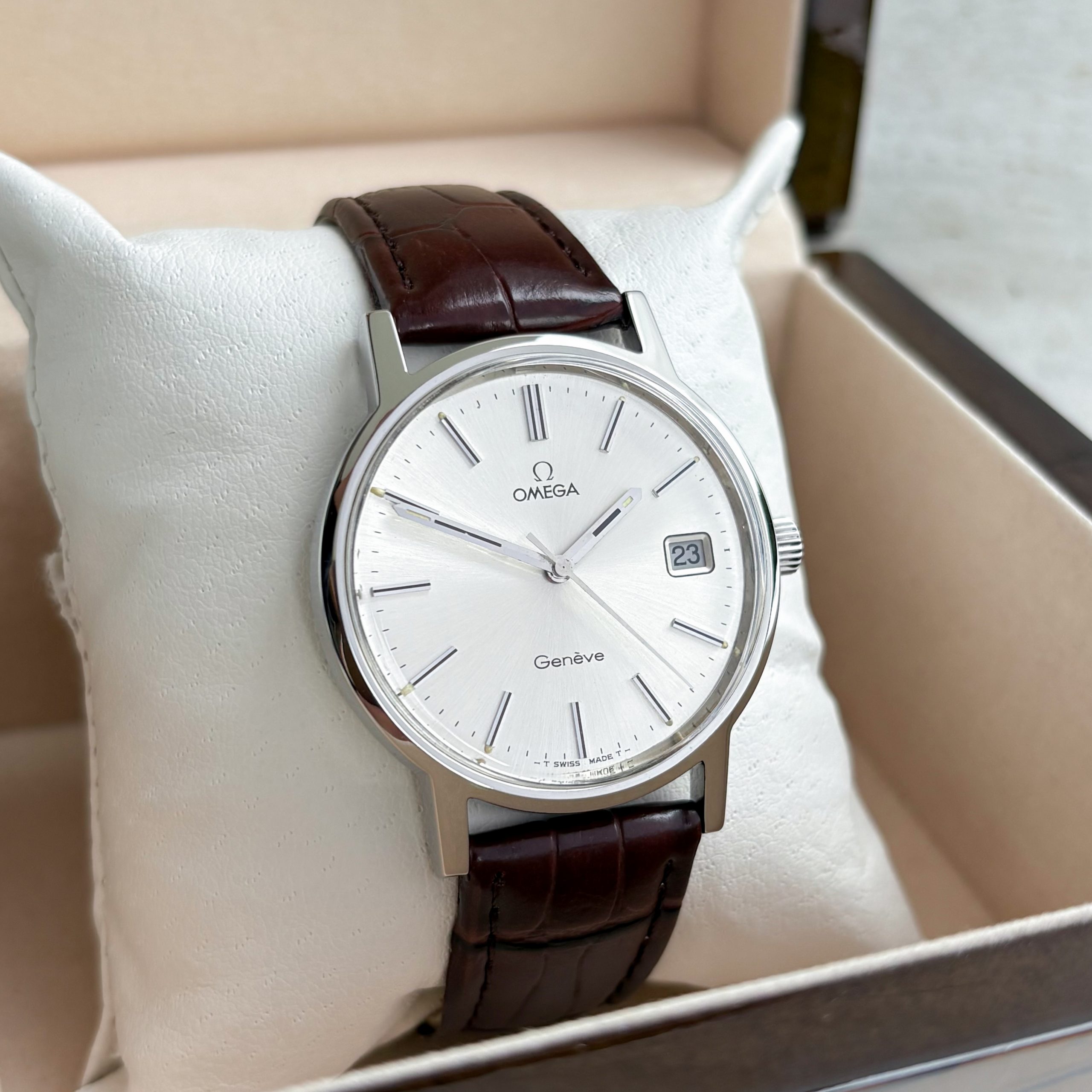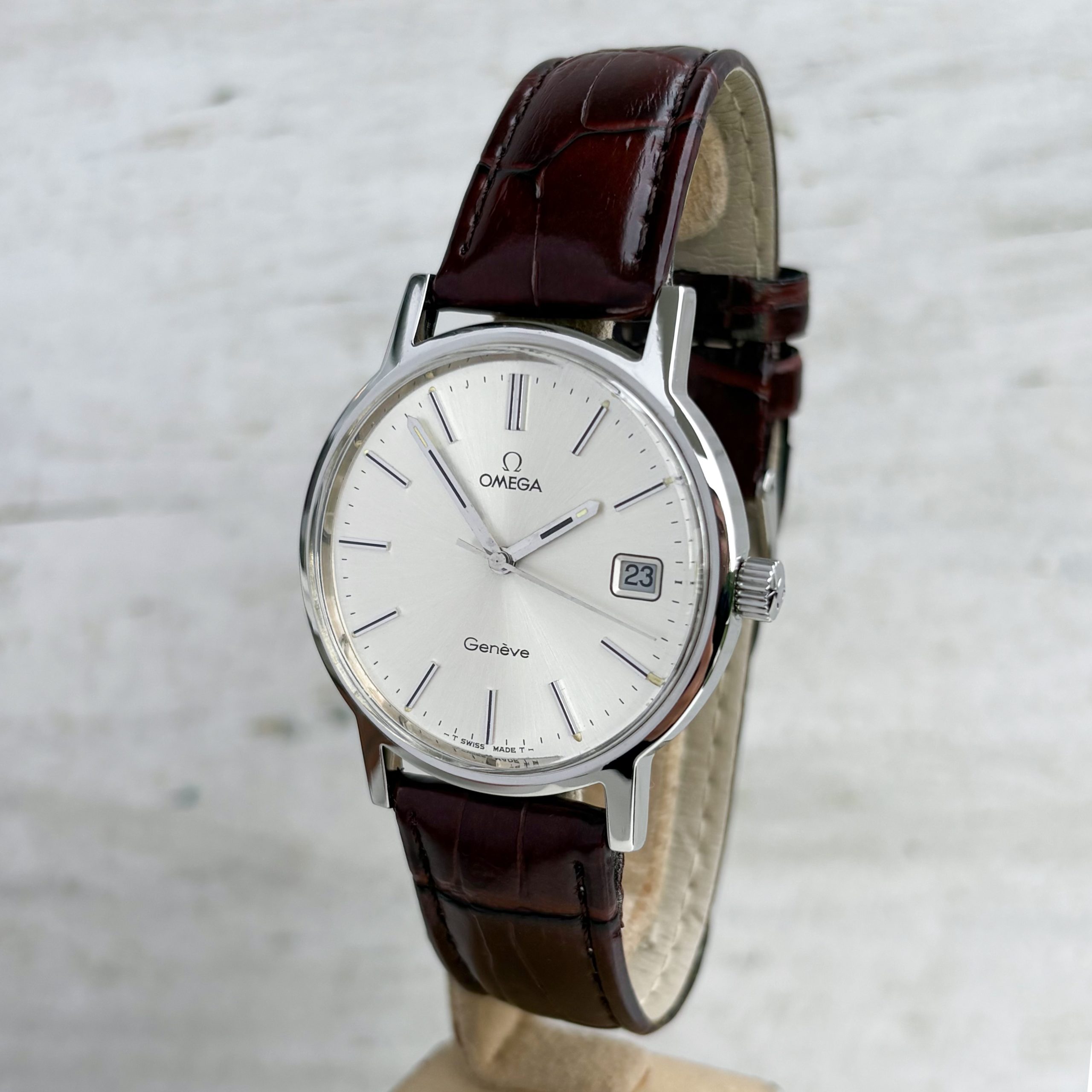 Marke: Omega Modell: Geneve Ref: 136.0104 Uhrwerk: Handaufzug Kal. 1030 Jahr: ca. 1974 Gehäuse: Stahl Zifferblatt: Silber Glas: Plexiglas Armband: Lederarmband ( Neutral ) Braun Schließe: Dornschließe Stahl Krone: Original Omega Krone Funktion: Stunde, Minute, Zentralsekunde, Datum Box: Hauseigene Uhrenbox Papiere: Hauseigenes Echtheitszertifikat Technischer Zustand: Sehr guter Zustand Optischer Zustand: Sehr guter Zustand Garantie: Ein Jahr Garantie auf gebrauchte Uhren