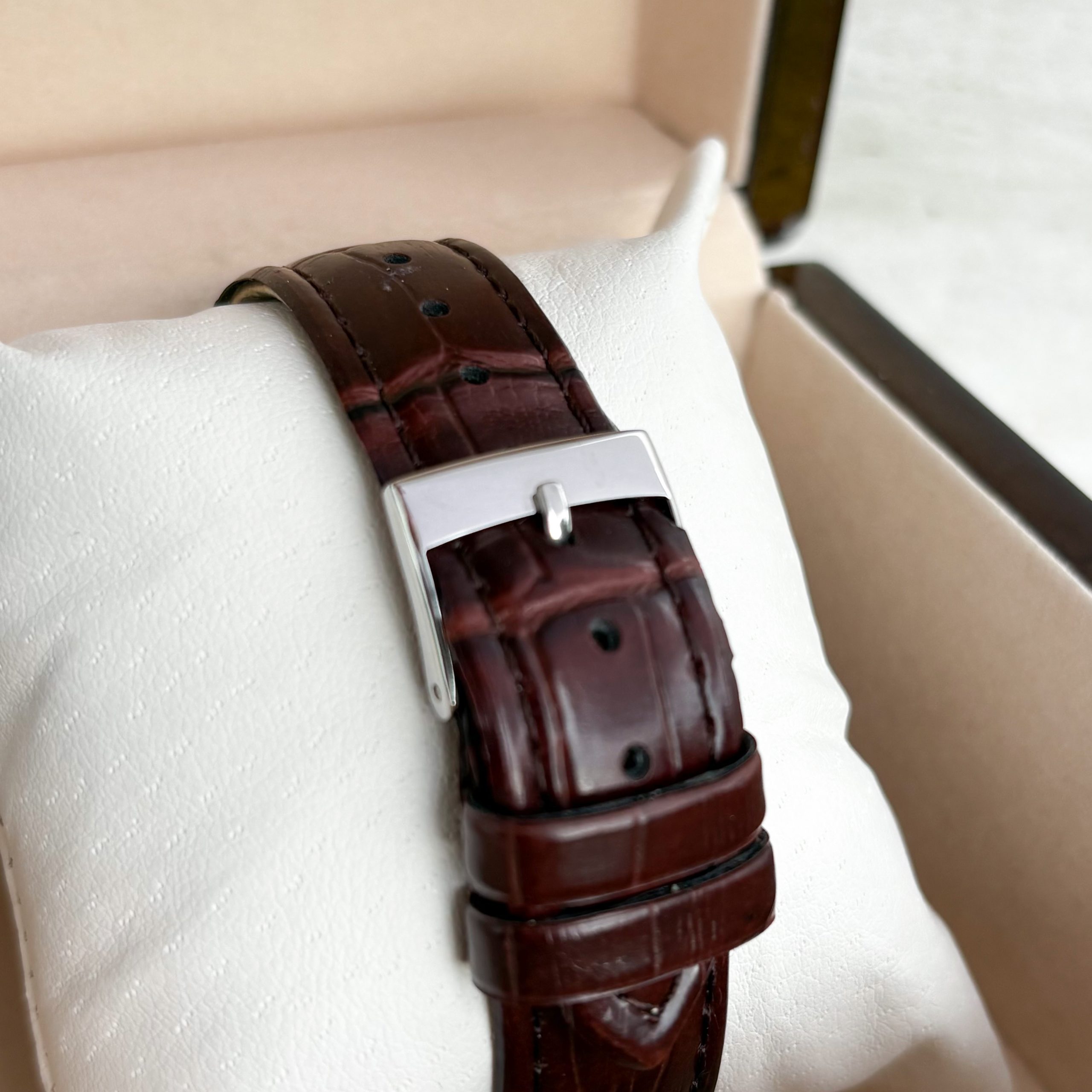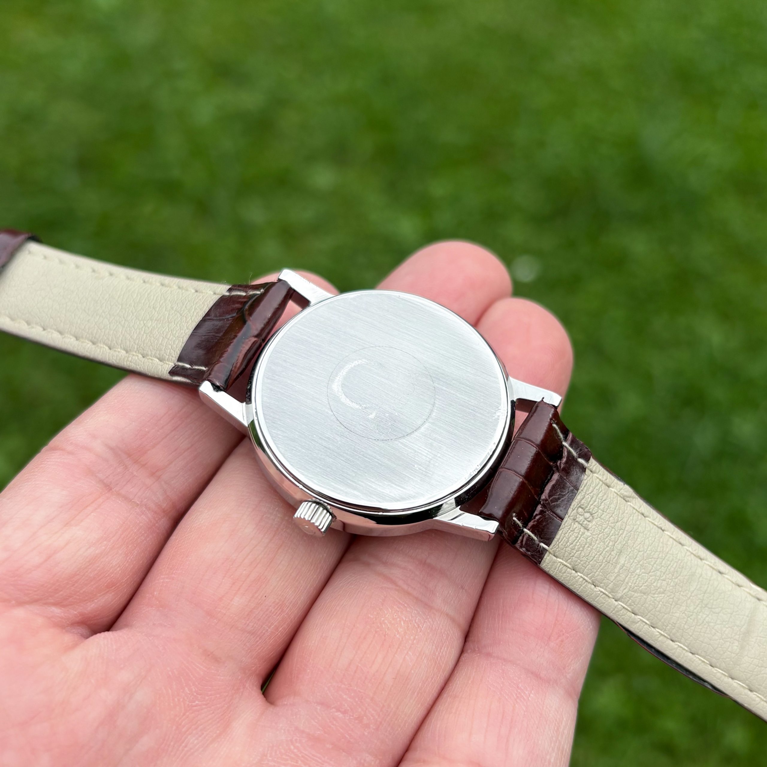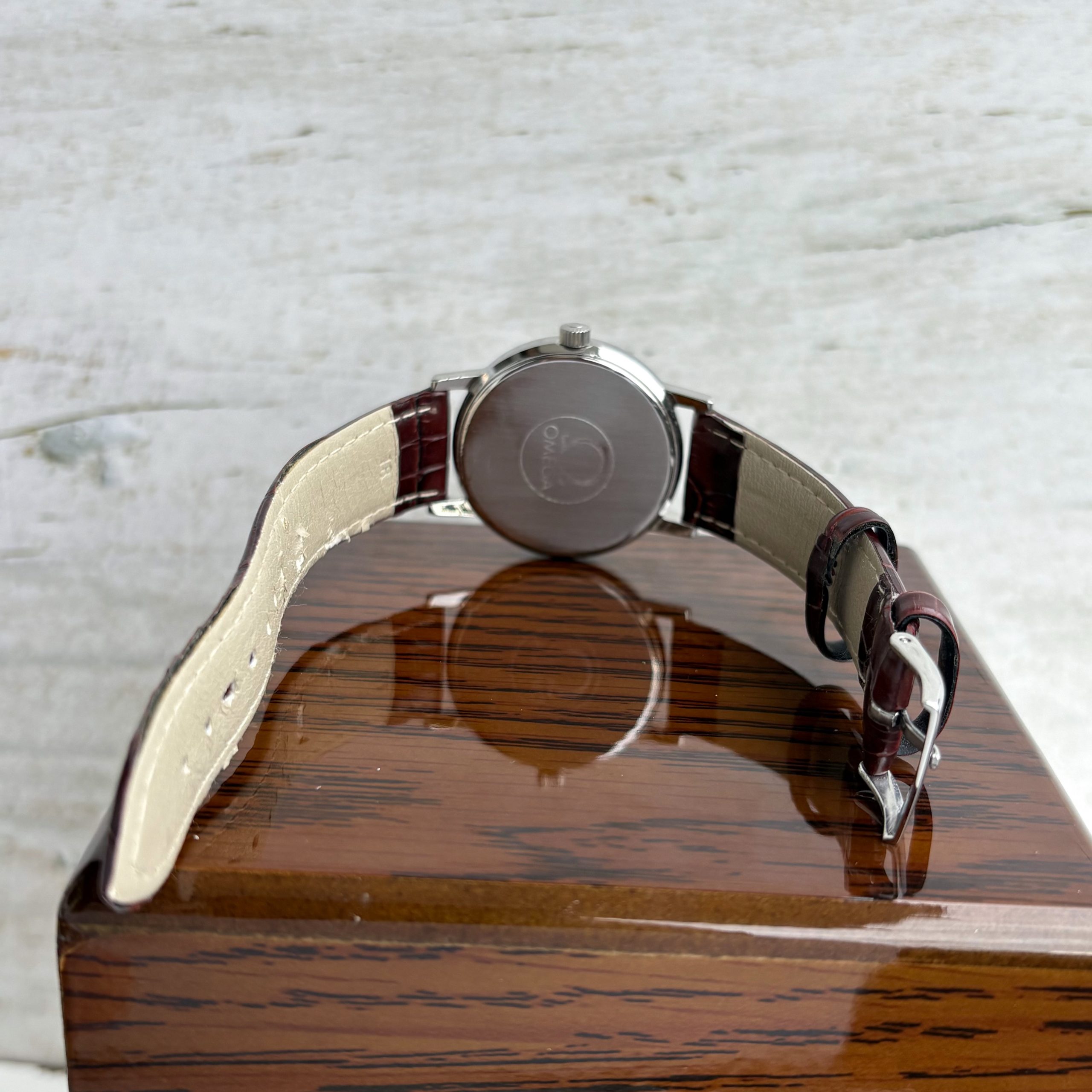 Dial: Silver Crystal: Plexiglas Buckle: Steel Buckle Strap: Leather Strap ( Neutral ) Brown Crown: Omega Crown Box: Our company's watch box Paper: Certificate of Authenticity Working Condition: Very Good Optical Condition: Very Good Warranty: One-year warranty on used watches
