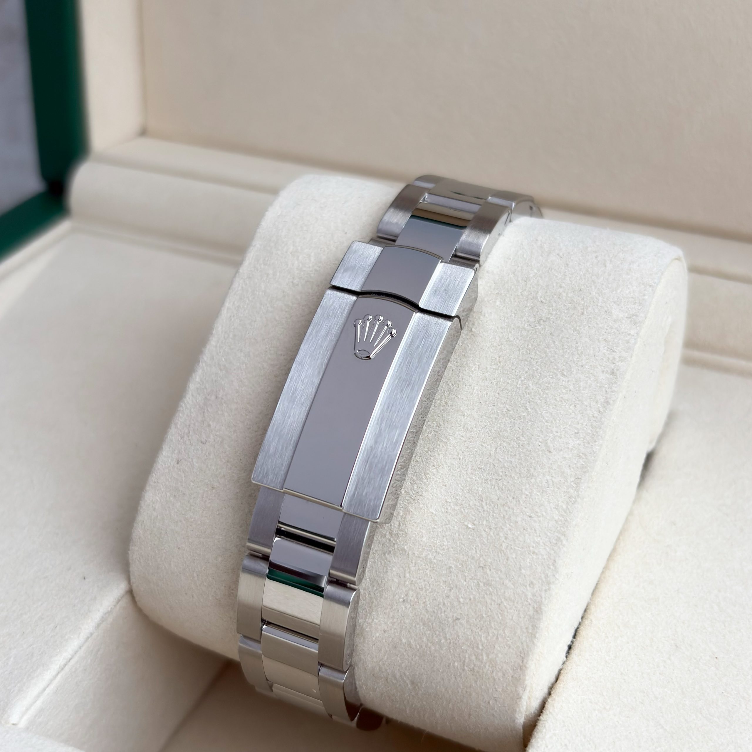 Bezel: Diamond Bezel with 46 VS Diamonds 1 CT ( Custom ), White gold bezel is included. Dial: Original Rolex Dial green Crystal: Sapphire Bracelet: Rolex Oyster Bracelet Buckle: Rolex Oyster Double Deployment Buckle Crown: Rolex Crown Box: Rolex Watch box Paper: Rolex Papers Working Condition: Very good ( UNWORN ) Optical Condition: Very good ( UNWORN ) Warranty: One-year warranty on used watches