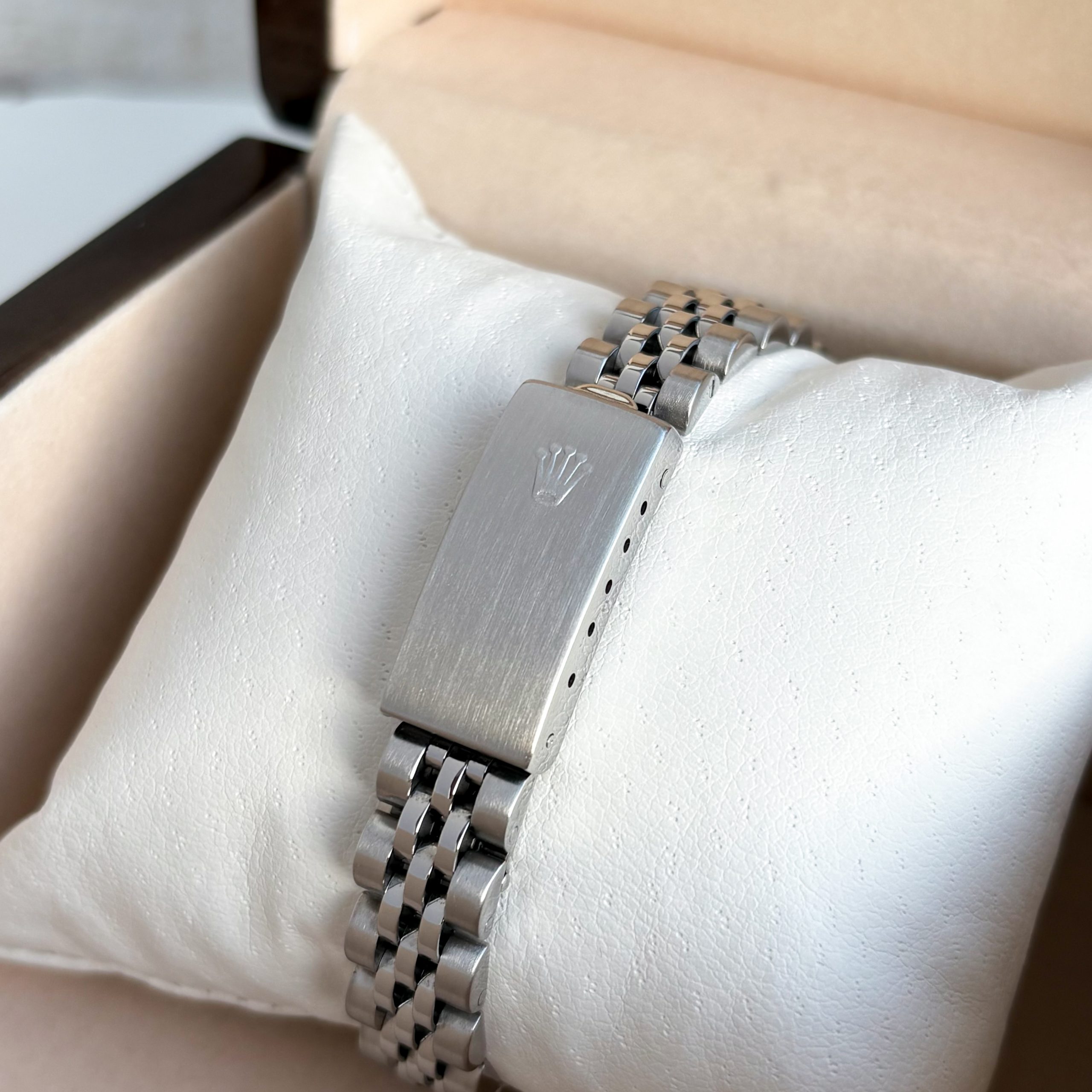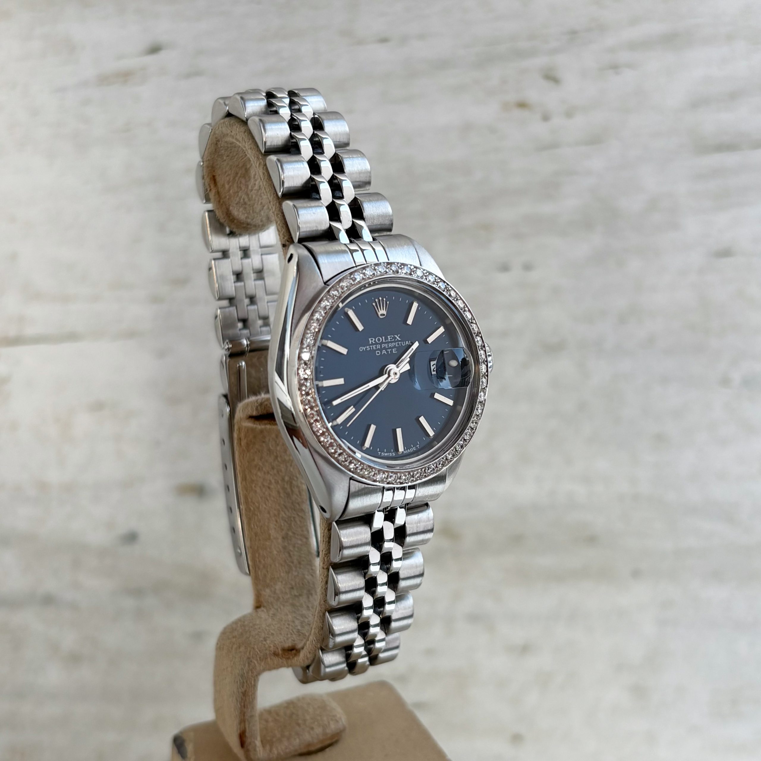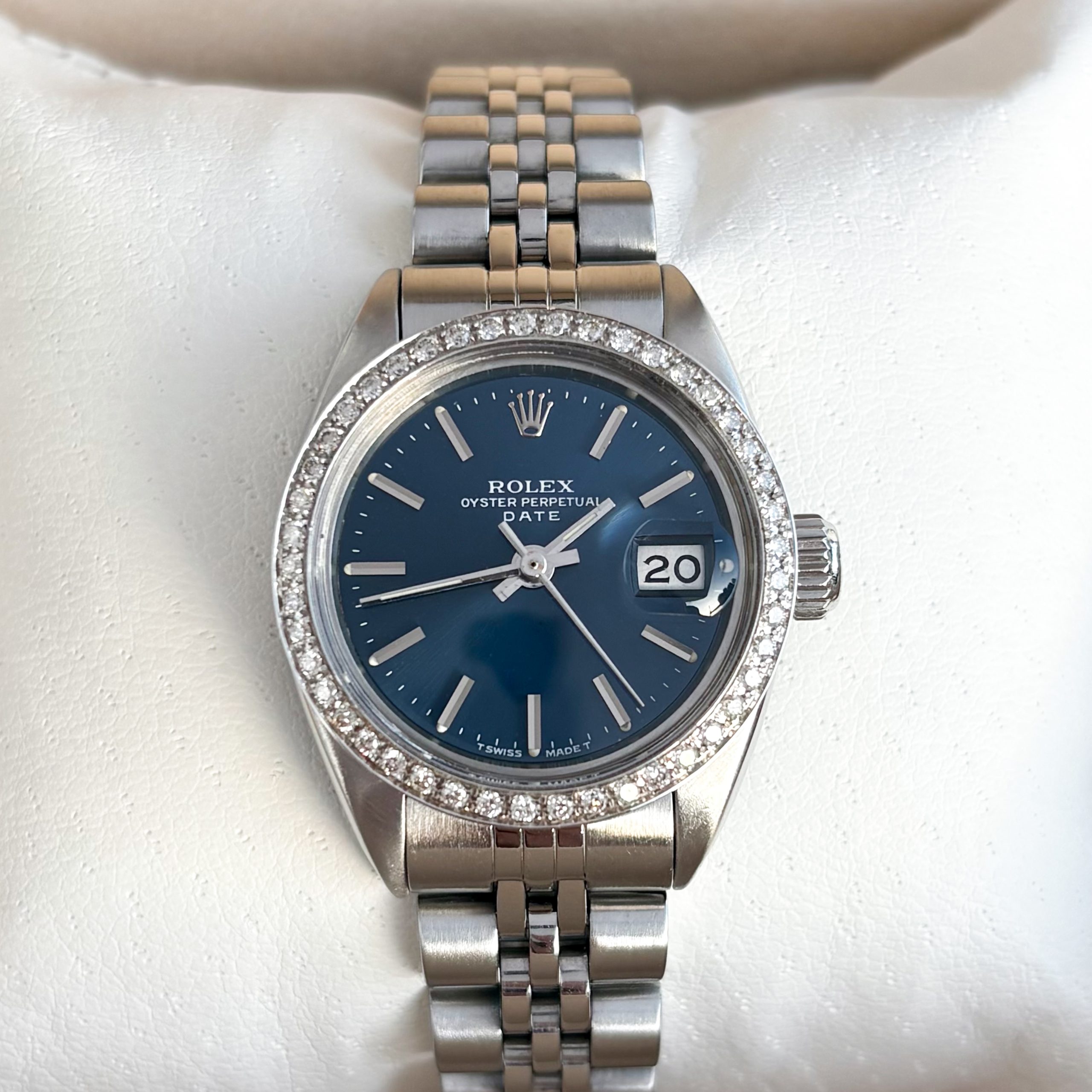 Marke: Rolex Modell: Oyster Perpetual Date 26mm Ref: 6917 Uhrwerk: Automatik Jahr: 1981 Gehäuse: Edelstahl Lünette: Mit Diamanten ca. 0,5 CT 50 Stück Reinheit VS/H Ersatzlünette Edelstahl ( Custom ) Zifferblatt: Original Rolex Zifferblatt Blau Glas: Saphirglas Armband: Rolex Jubilee Armband Schließe: Rolex Jubilee Faltschließe Krone: Rolex Krone Funktion: Stunde, Minute, Zentralsekunde, Datum Box: Hauseigene Uhrenbox Papiere: Hauseigenes Echtheitszertifikat Technische Zustand: Sehr guter Zustand Optische Zustand: Sehr guter Zustand Garantie: Ein Jahr Garantie auf die gebrauchten Uhren