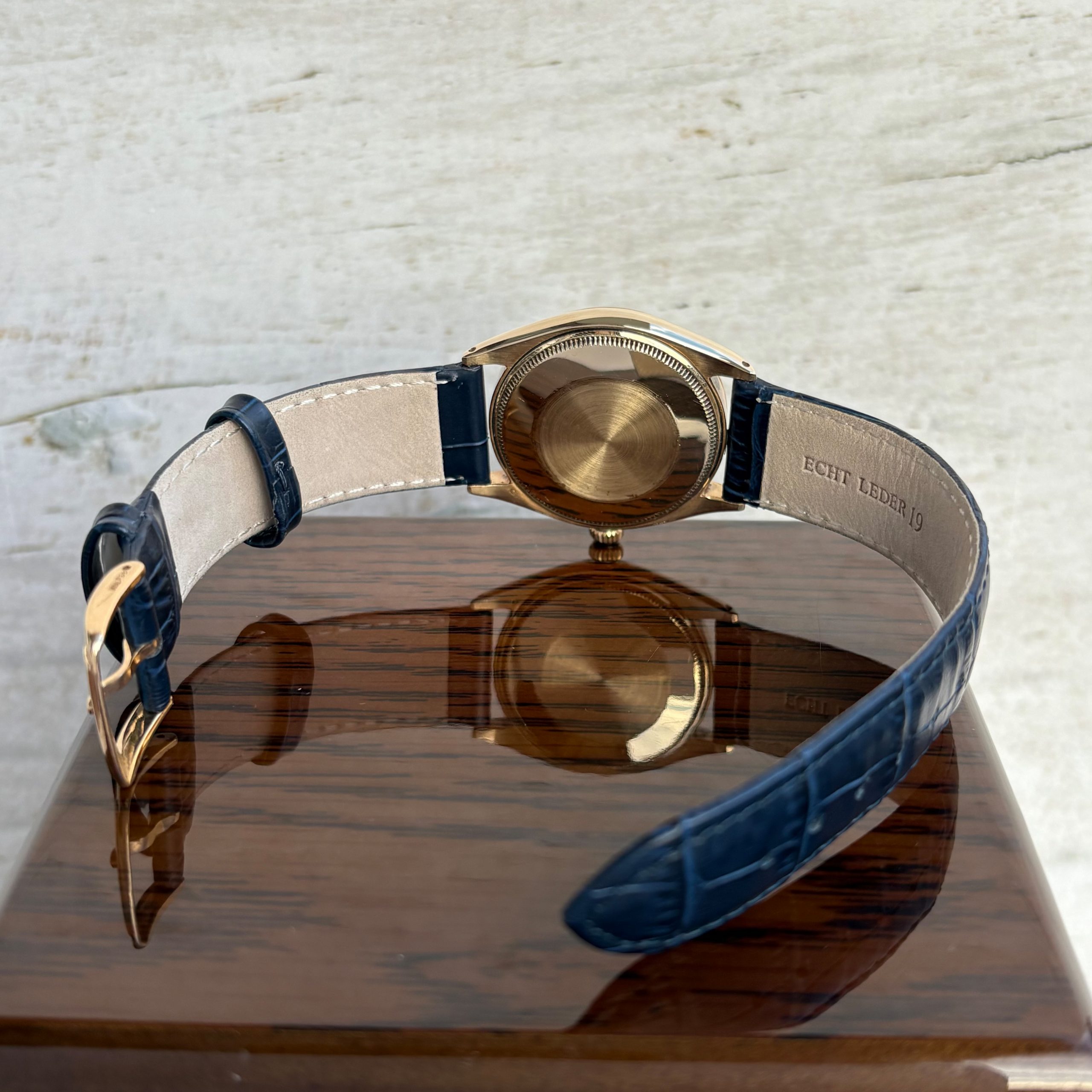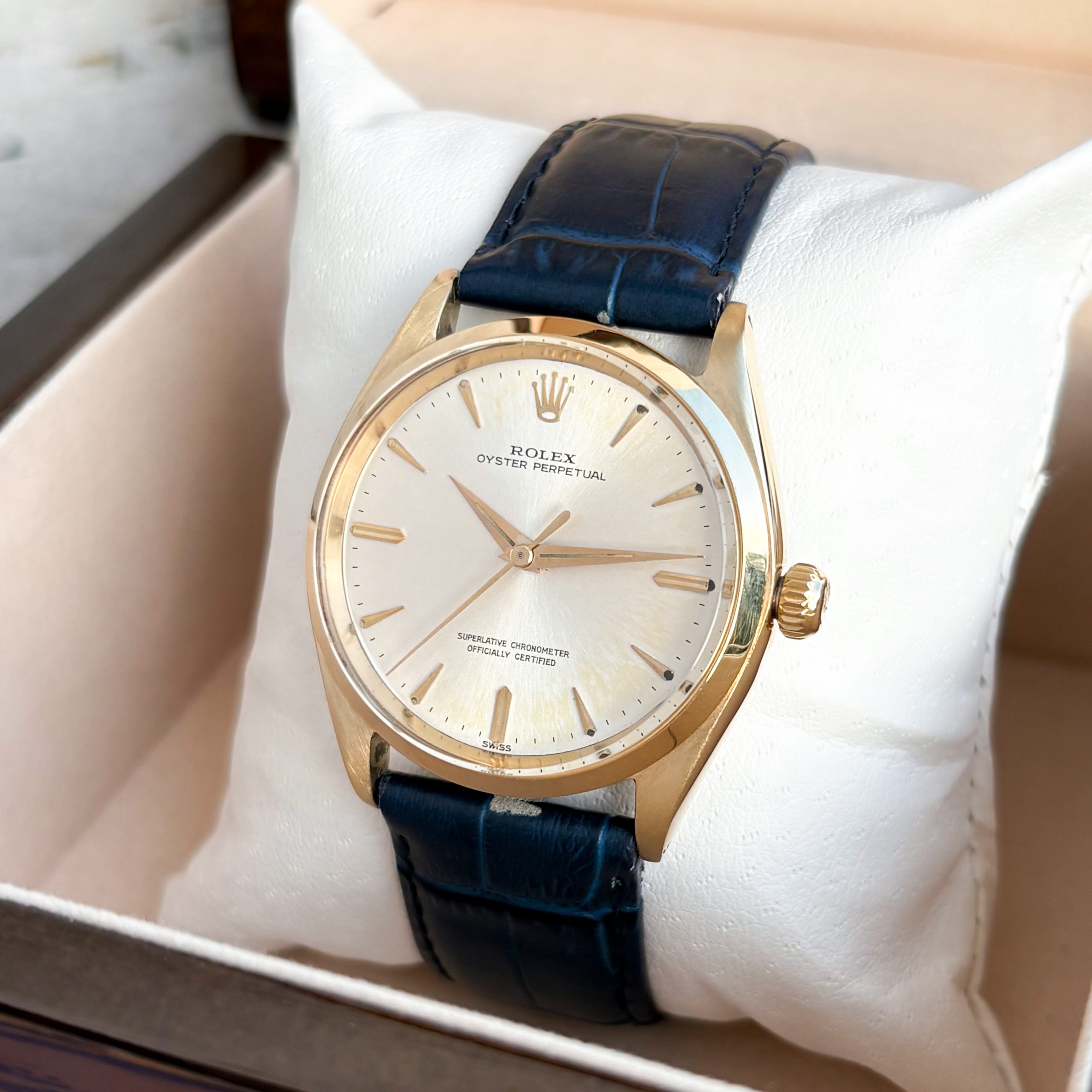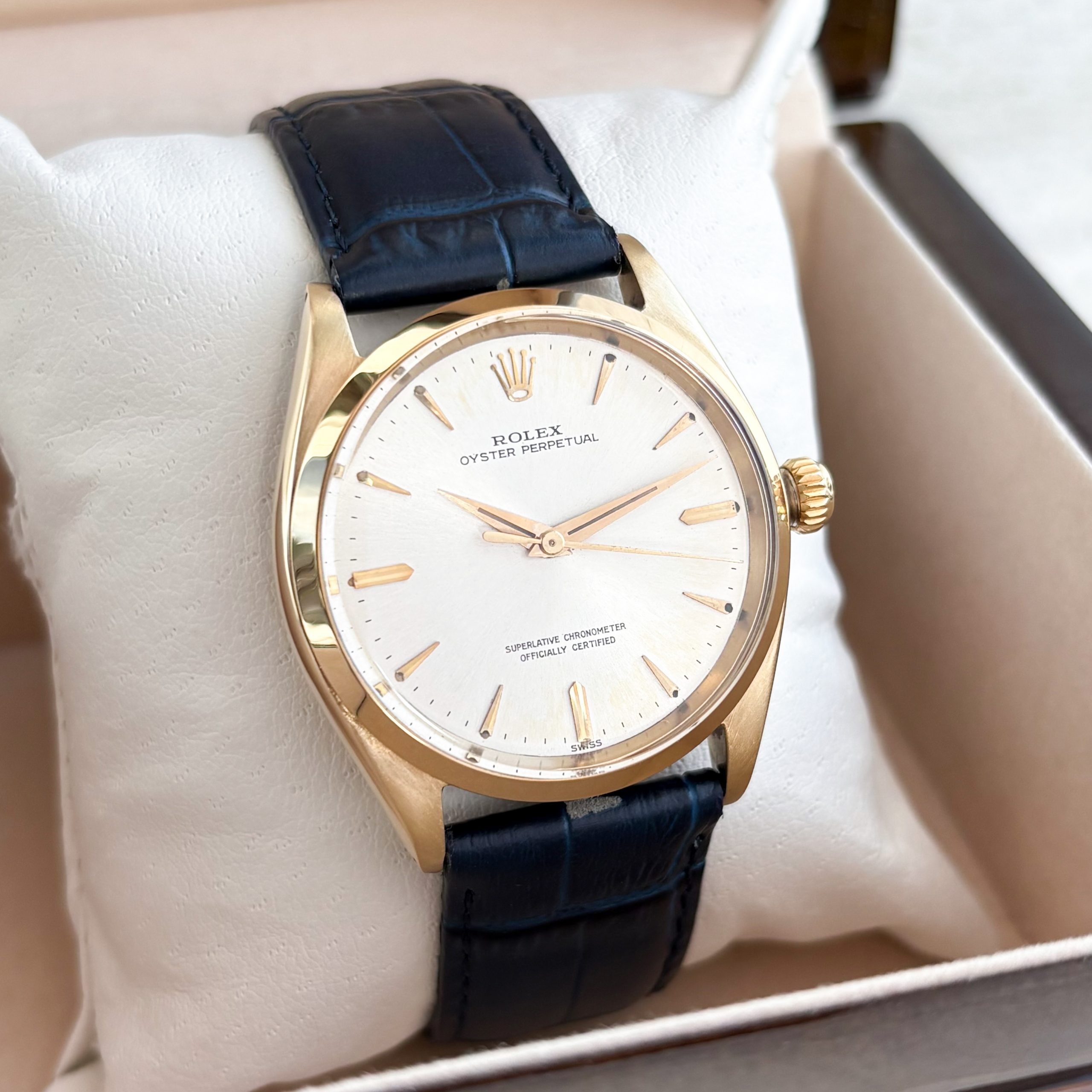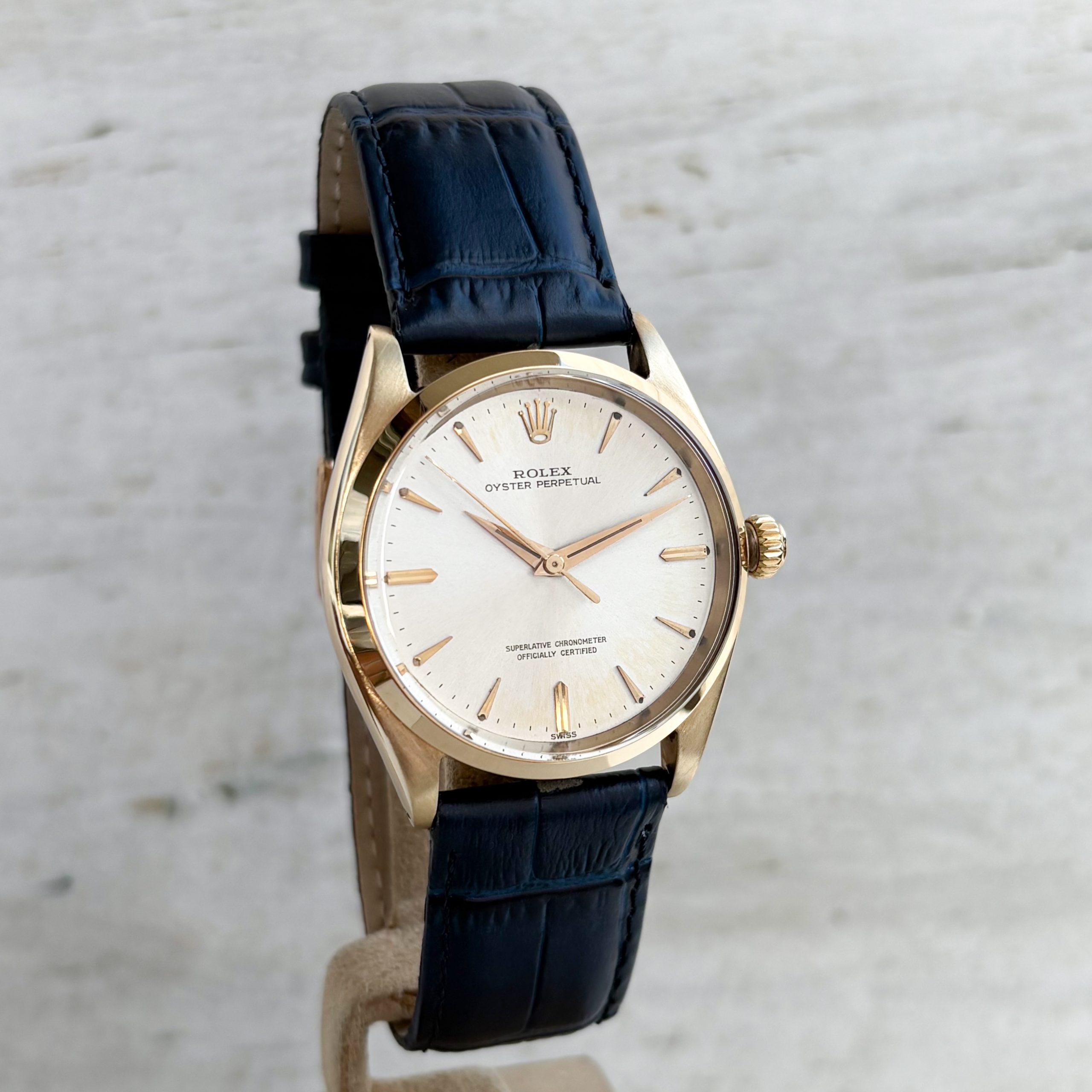 Marke: Rolex Modell: Oyster Perpetual 34 Ref: 1007 Uhrwerk: Automatik Jahr: 1951 Gehäuse: 14k Gelbgold Lünette: 14k Gelbgold Zifferblatt: Original Rolex Zifferblatt Champagner Glas: Plexiglas Armband: Lederarmband Schwarz (Neutral) Schließe: Dornschließe vergoldet Krone: Rolex Krone Funktion: Stunde, Minute, Zentralsekunde Box: Hauseigene Uhrenbox Papiere: Hauseigenes Echtheitszertifikat Technische Zustand: Sehr guter Zustand Optische Zustand: Sehr guter Zustand Garantie: Ein Jahr Garantie auf die gebrauchten Uhren